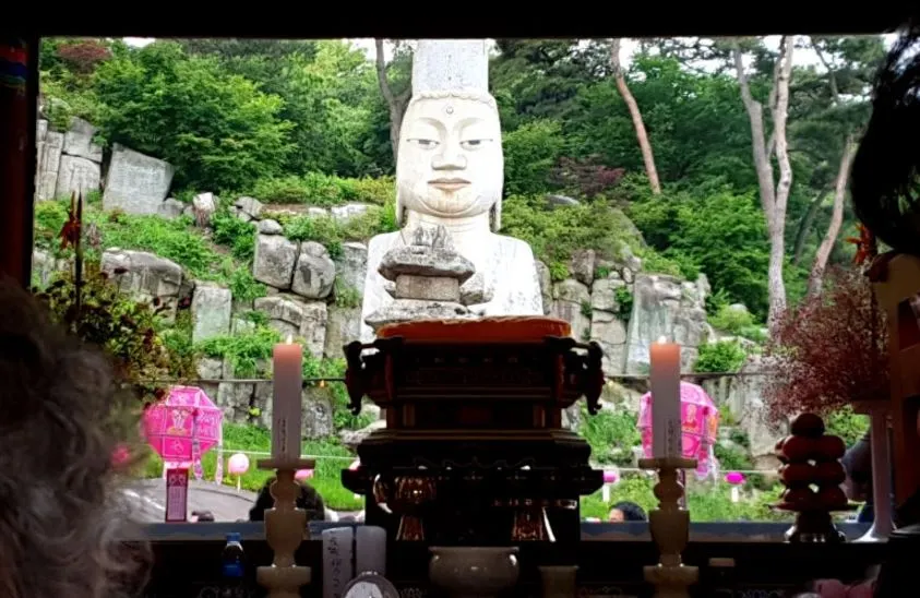 미륵전에서 보이는 미륵보살입상 (사진출처: https://blog.naver.com/geulpower/221282408464)