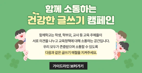 ‘함께 학교’라는 플랫폼이 있다. 교육부가 운영하는 사이트인데 회원가입을 하면 교육 정책을 제안하거나 궁금한 것을 질문할 수 있고 진로 설계 등의 도움도 받을 수 있는 곳이다. 요즘에는 공모전 소식을 올려주는 게시판도 생겨서 매일 들락날락하고 있다.