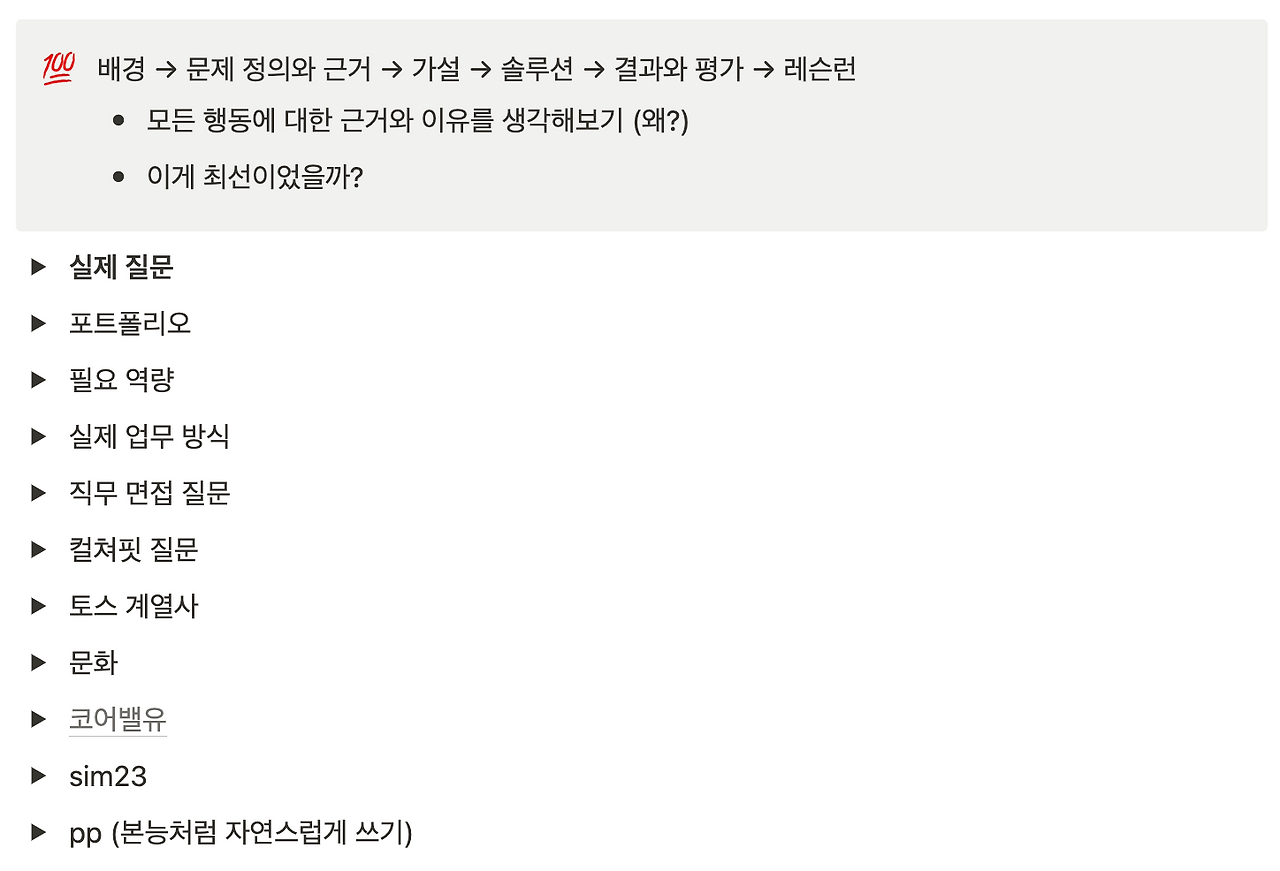 그렇게 예상질문을 150개 정도 적었고, 대답이 비슷할 것 같은 질문은 묶어 100개 정도로 추렸다. 노션의 토글에 질문을 적고 답변은 토글을 펼쳤을 때 볼 수 있도록 만들었다.