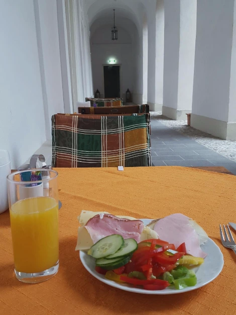 방에서 나와 설렁설렁 복도를 지나 1층으로 내려왔다. 고요한 잘츠부르크의 아침, 조식을 먹는 이들은 그렇게 많지 않았다. 여느 숙소에서 먹었던 조식들과 비슷하게 빵과 햄, 치즈, 과일과 야채들이 테이블 위에 놓여 있었다.
