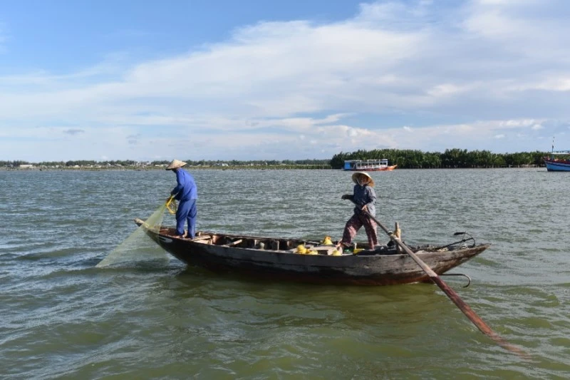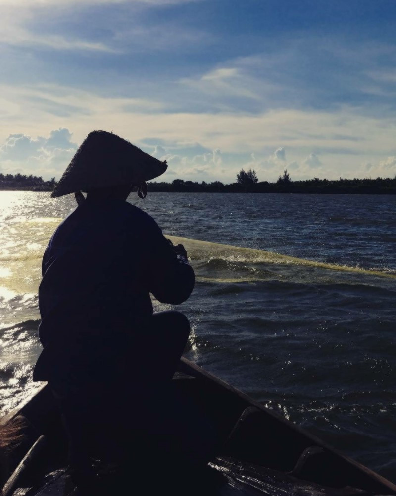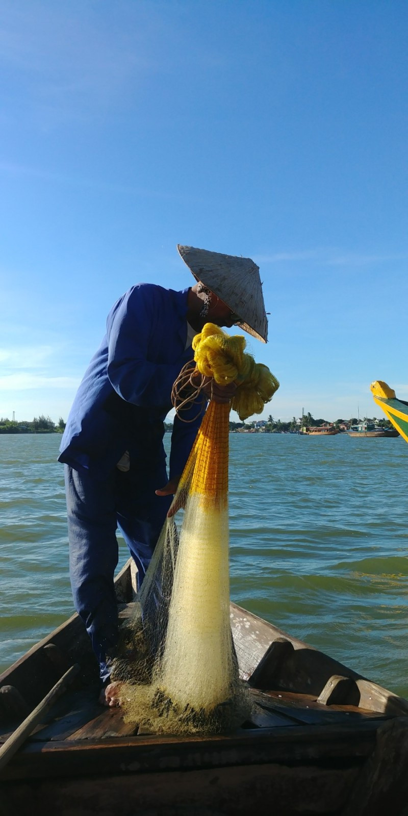 나무로 된 조그만 배 위에 올라 강 위로 그물을 던지고 계셨다.