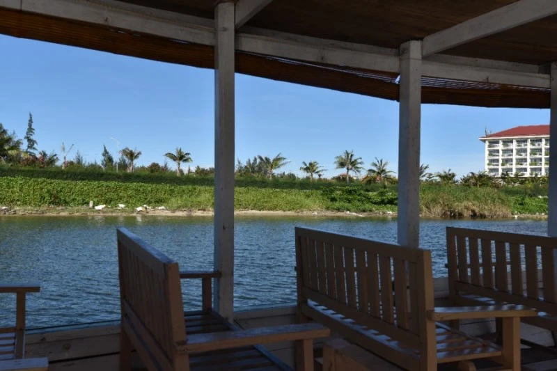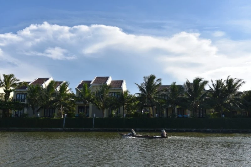 푸른 하늘 아래 강변 옆으로 리조트와 나무들이 가득했다.