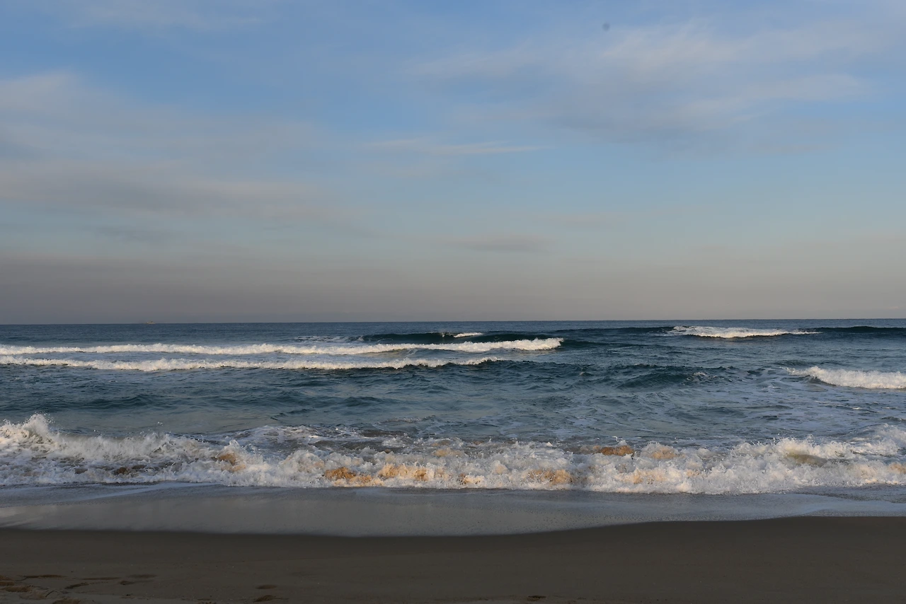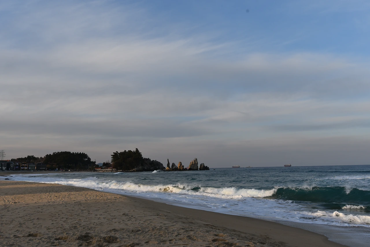 쏠비치 산책로를 따라 내려가면 촛대바위가 잘 보이는 추암 해변이 나타난다. 해변에 서서 나를 삼킬듯이 밀려오는 파도를 바라보았다. 모래가 아주 고와서 발이 쑥쑥 들어갔다.