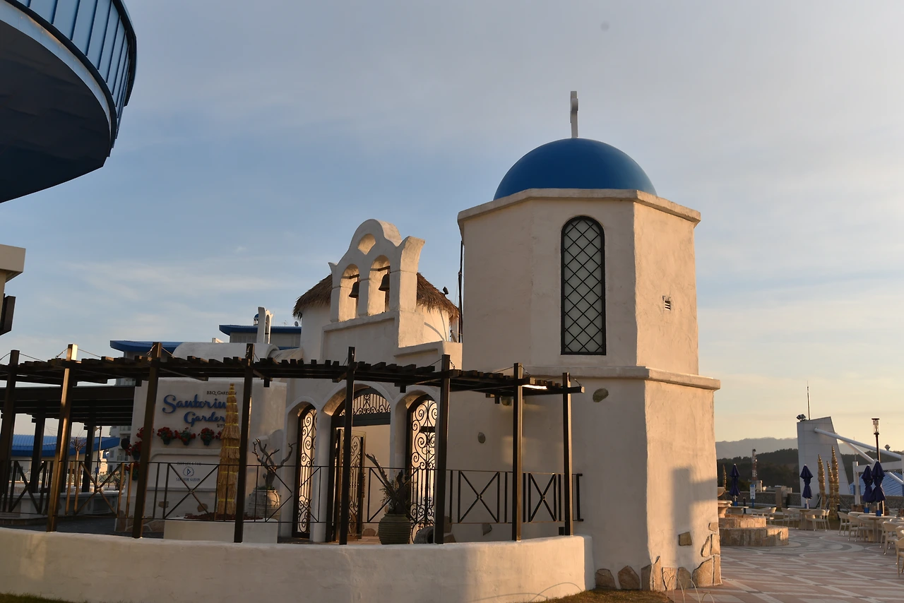 틈날 때마다 테라스로 나가 시원한 바람을 느껴보았다. 잔잔하게 모래를 적시는 파도, 그 주위로 하얀 외벽에 파란 지붕을 얹은 리조트 건물들이 보였다. 그리스 산토리니를 본 따 만들었다고 하는데 산토리니에 가보지 않았으니 비교할 수가 없었다. 그저 아름다운 풍경에 온 정신을 빼앗길 뿐! 철썩이는 파도소리와 바람소리가 귀를 울리고 눈 앞의 풍경은 비현실적이게 느껴졌다.