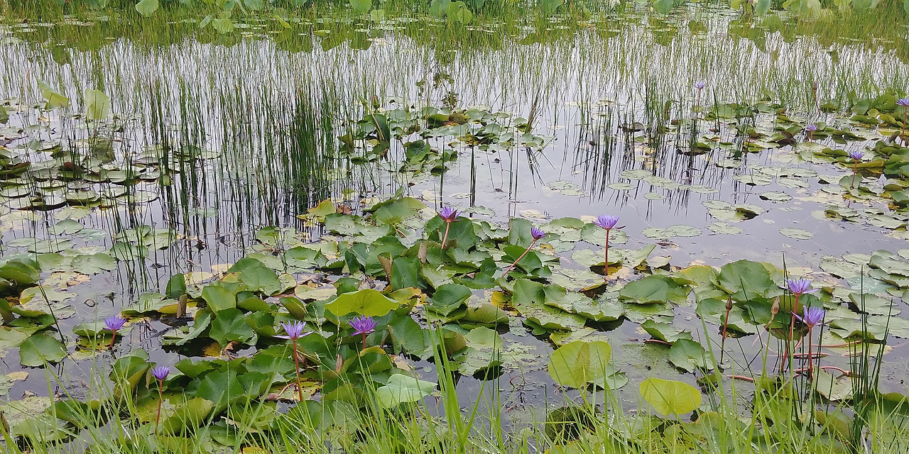 못 위에는 보랏빛 연꽃들이 피어있었다.