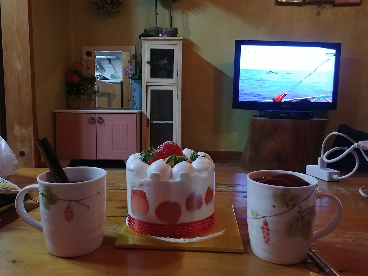 저녁 펜션으로 돌아와 집에서 싸들고온 따뜻한 뱅쇼와 딸기케이크.