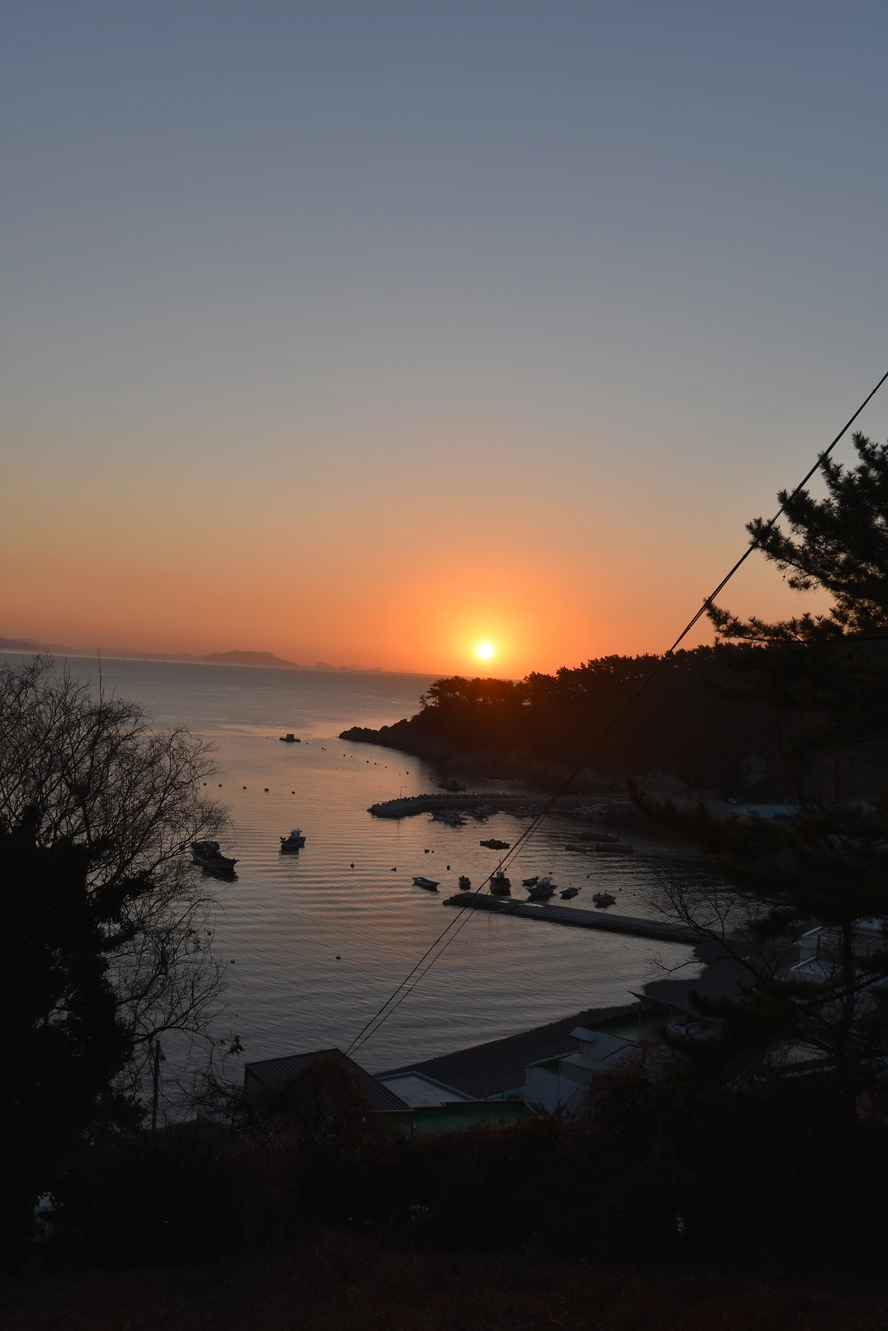 붉게 타오르는 하늘과 바다 그리고 조용한 어촌 마을.