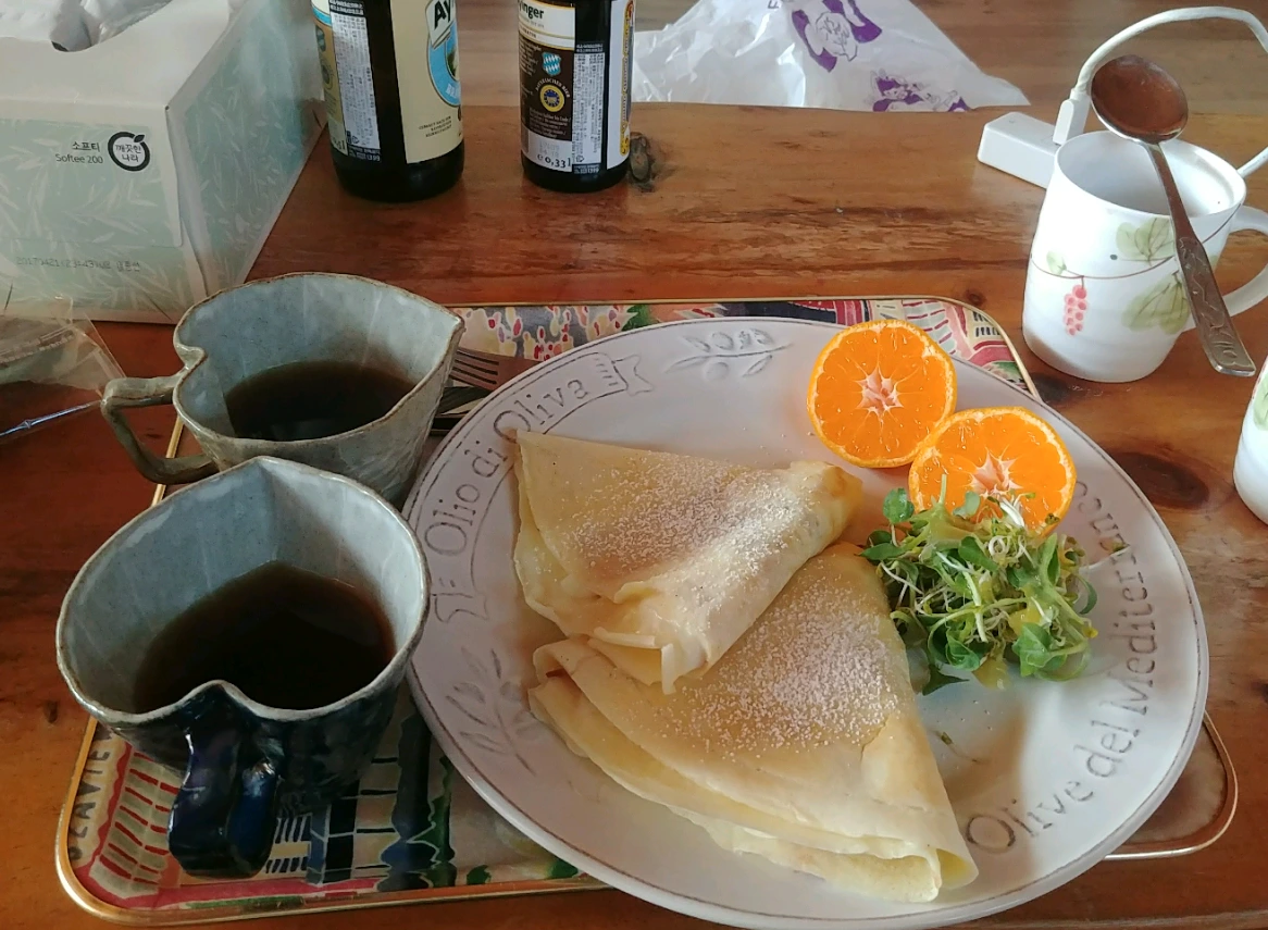 펜션에서 따끈한 크레페와 갓내린 커피를 조식으로 주셨다.