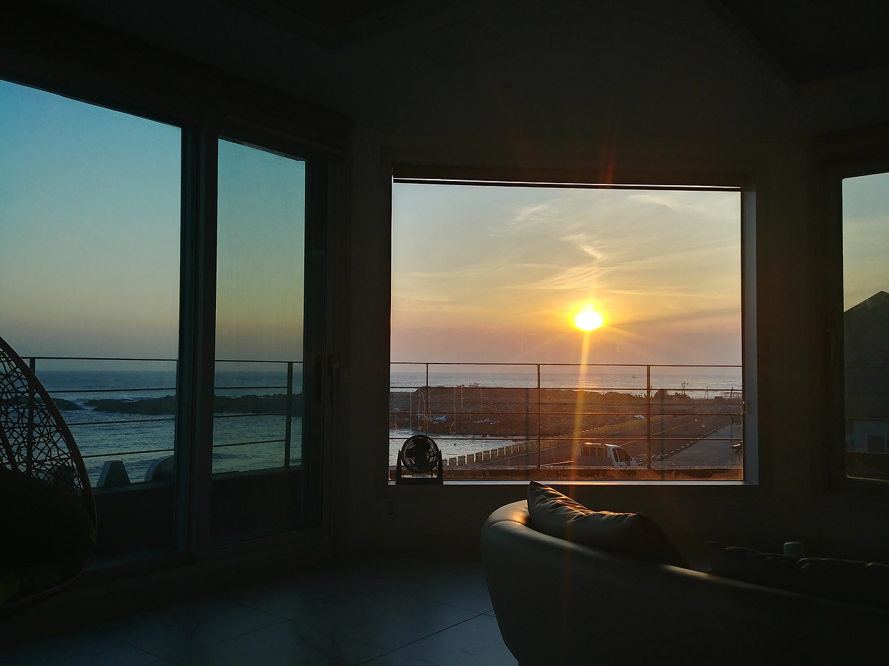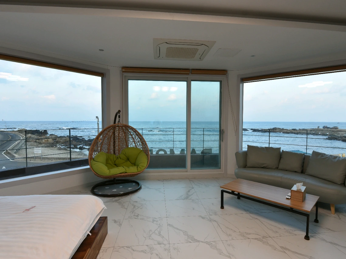 방 문을 여니 시원한 바다가 한 눈에 들어왔다.