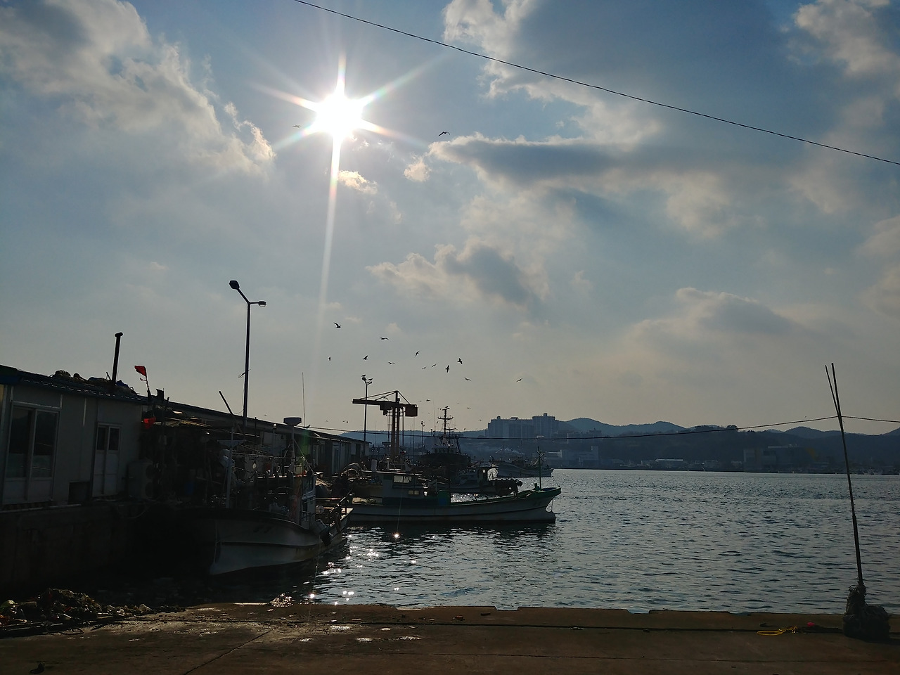 햇살 받아 반짝이는 바다와 갈매기들의 실루엣.