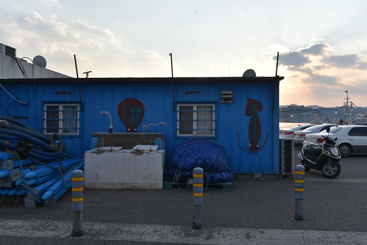 파란 컨테이너 위에 그려진 오징어가 귀엽다.