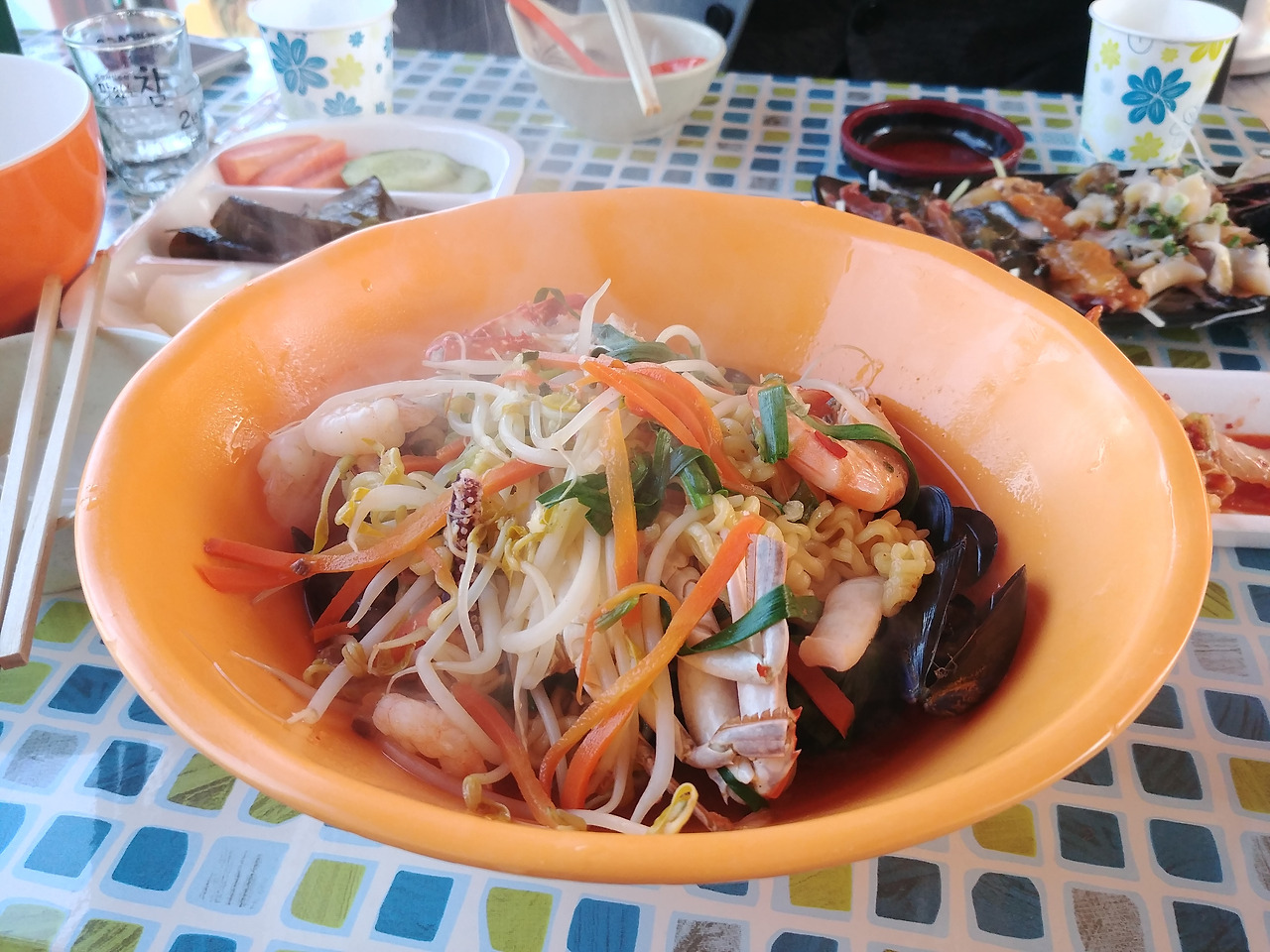 무얼 먹을까 고민하다가 해물모듬 소, 해물라면, 해물칼국수를 시켰다.