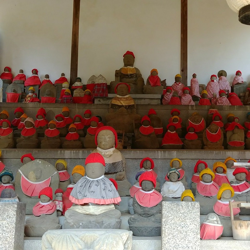 빨간 모자와 턱받이를 한 지장보살들.