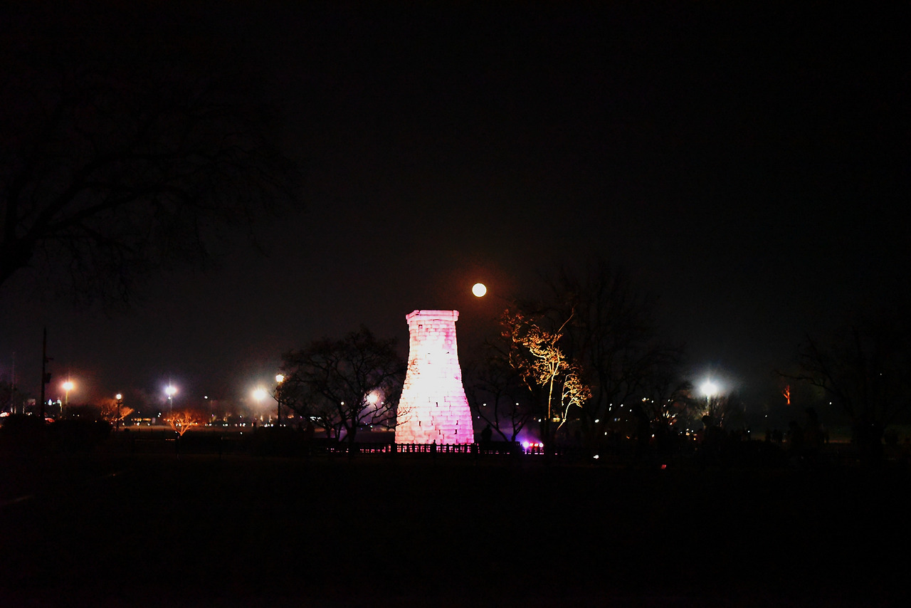 조명을 받아 분홍색으로 빛나고 있는 첨성대 옆에 둥그런 보름달이 떴다.