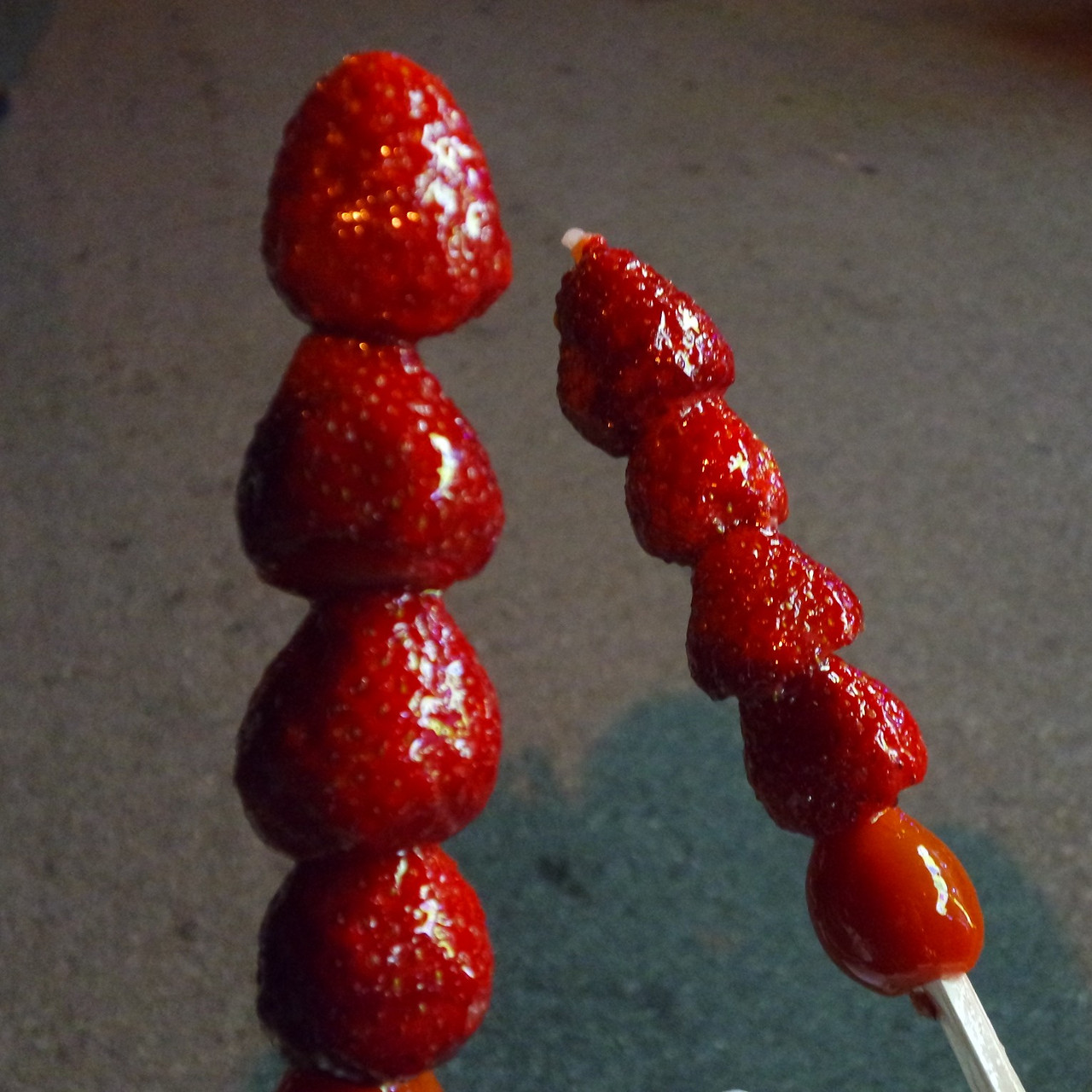 출출하니 딸기 꼬치를 사들고 사람들을 따라 걸었다.
