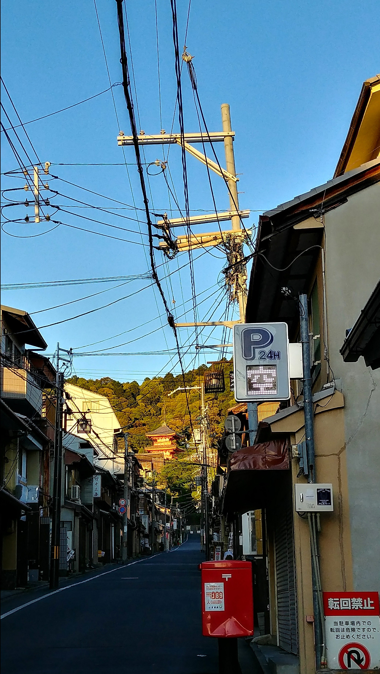 멀리 보이는 기요미즈데라는 지는 햇살에 노랗게 물들었다.