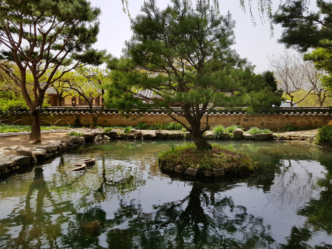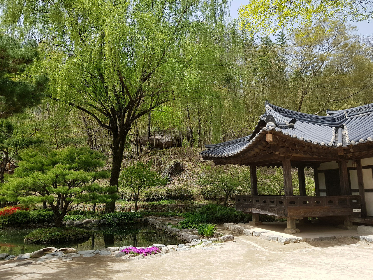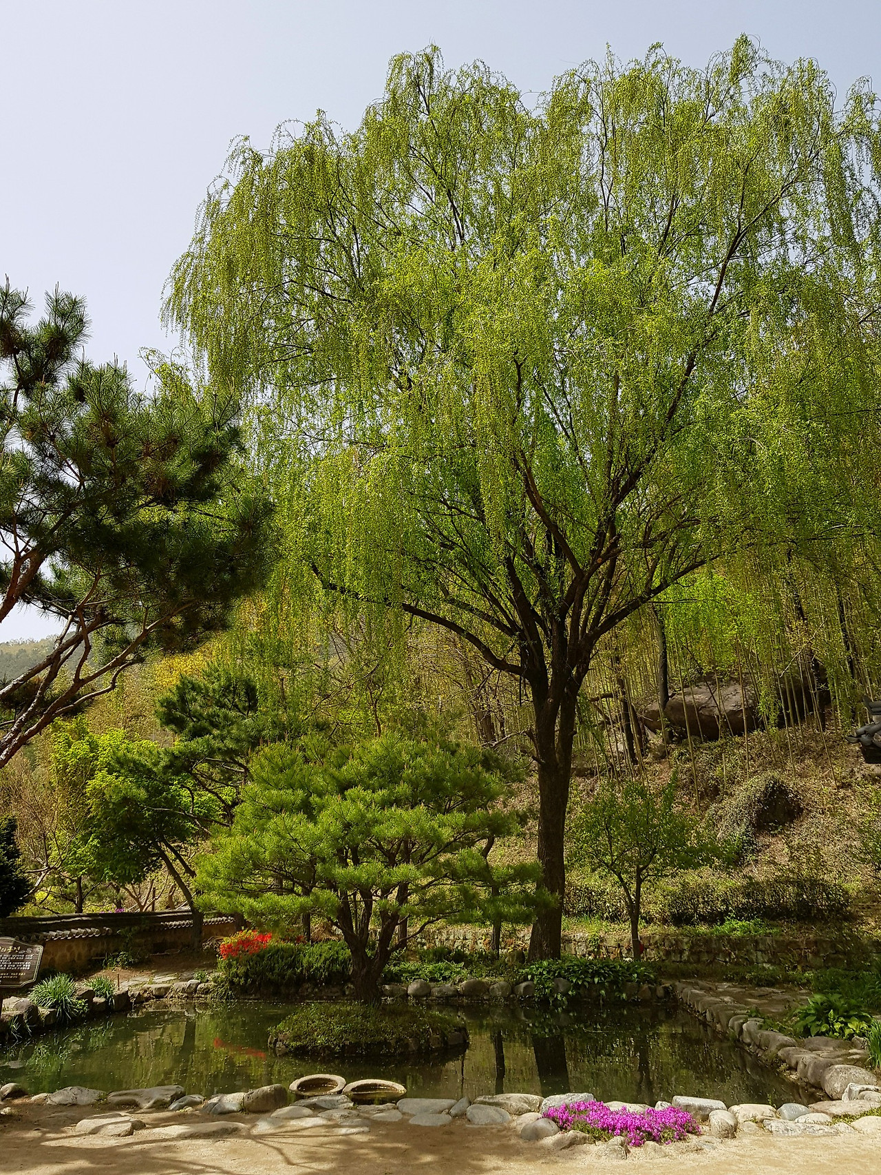 잎파리가 길게 못 위로 늘어진 버들나무와 소담한 소나무가 눈에 들어온다.