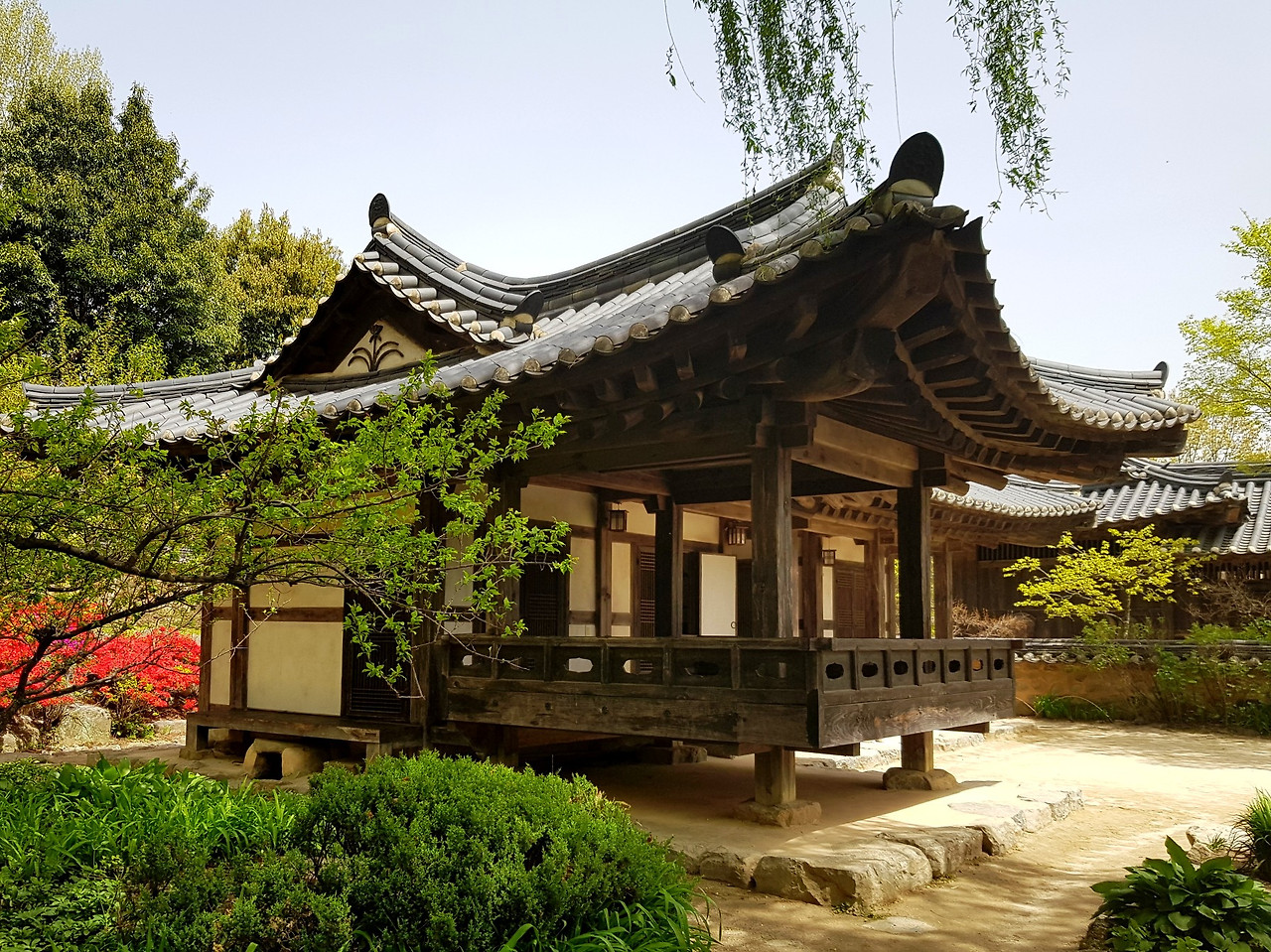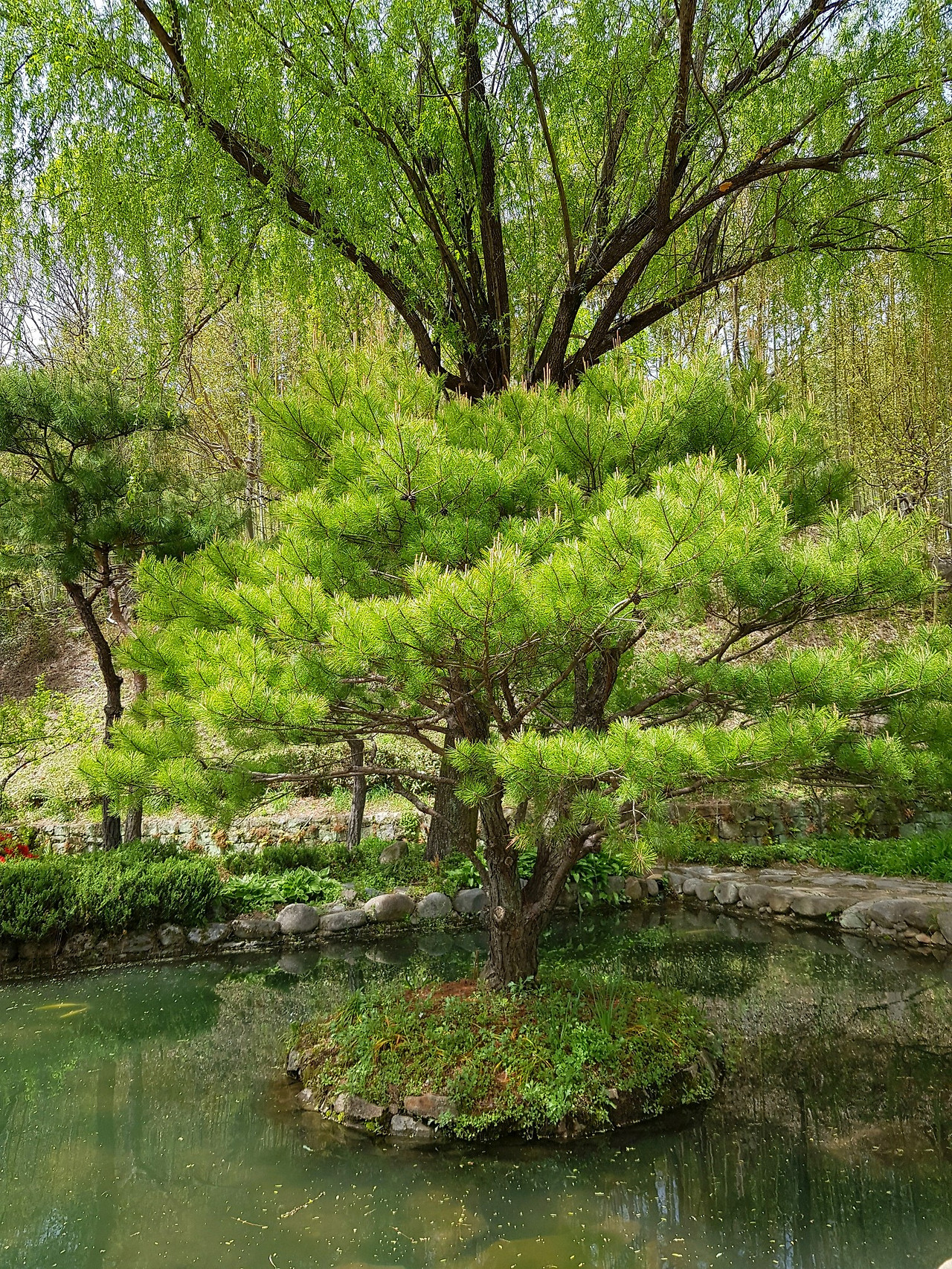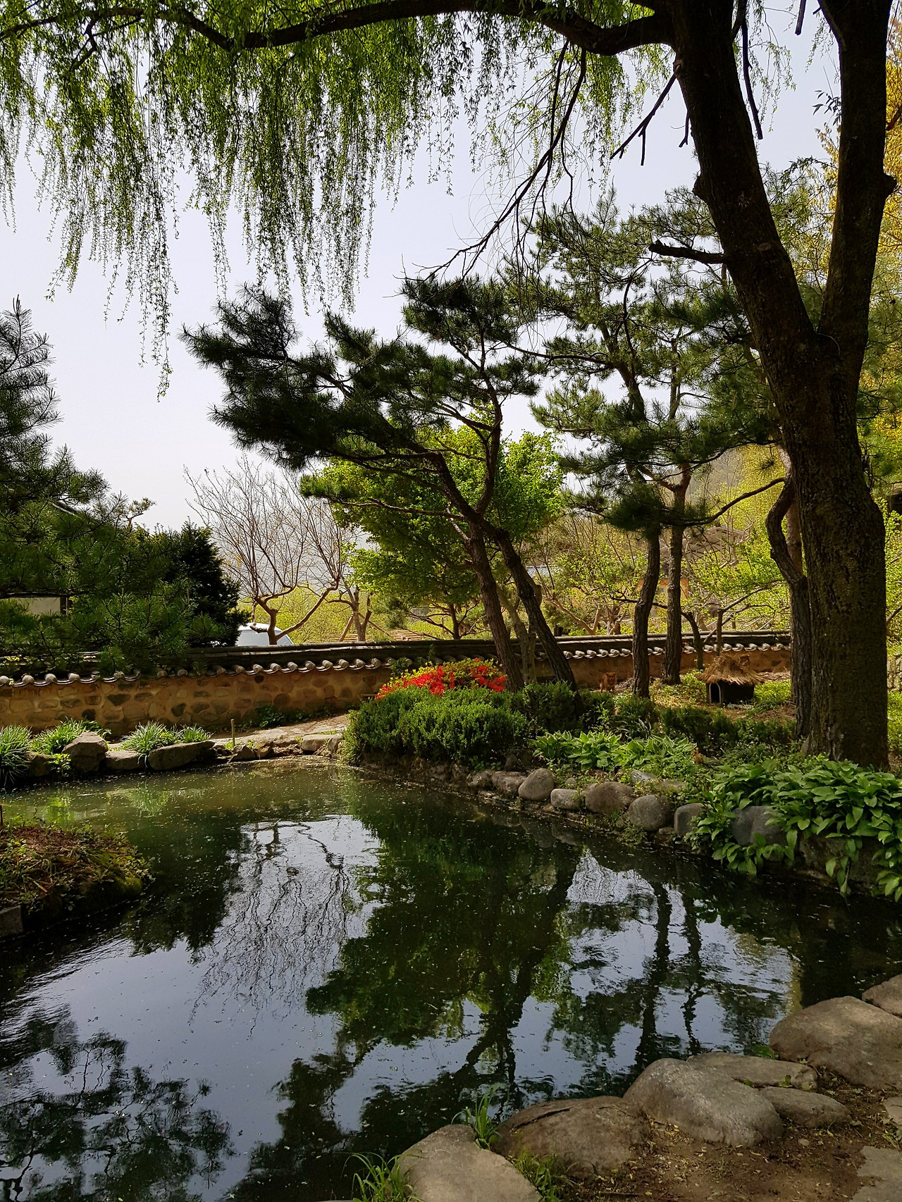 잎파리가 길게 못 위로 늘어진 버들나무와 소담한 소나무가 눈에 들어온다.