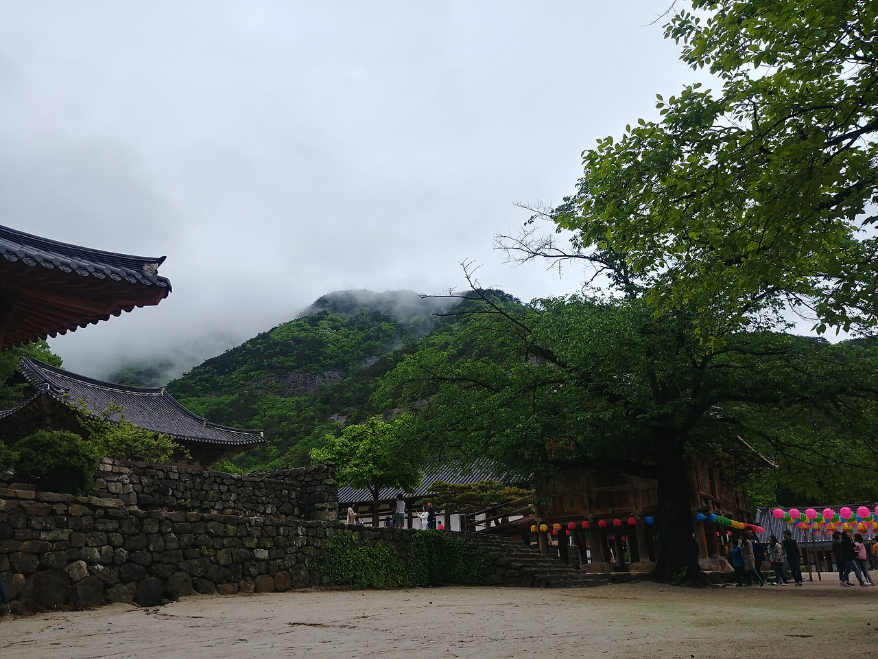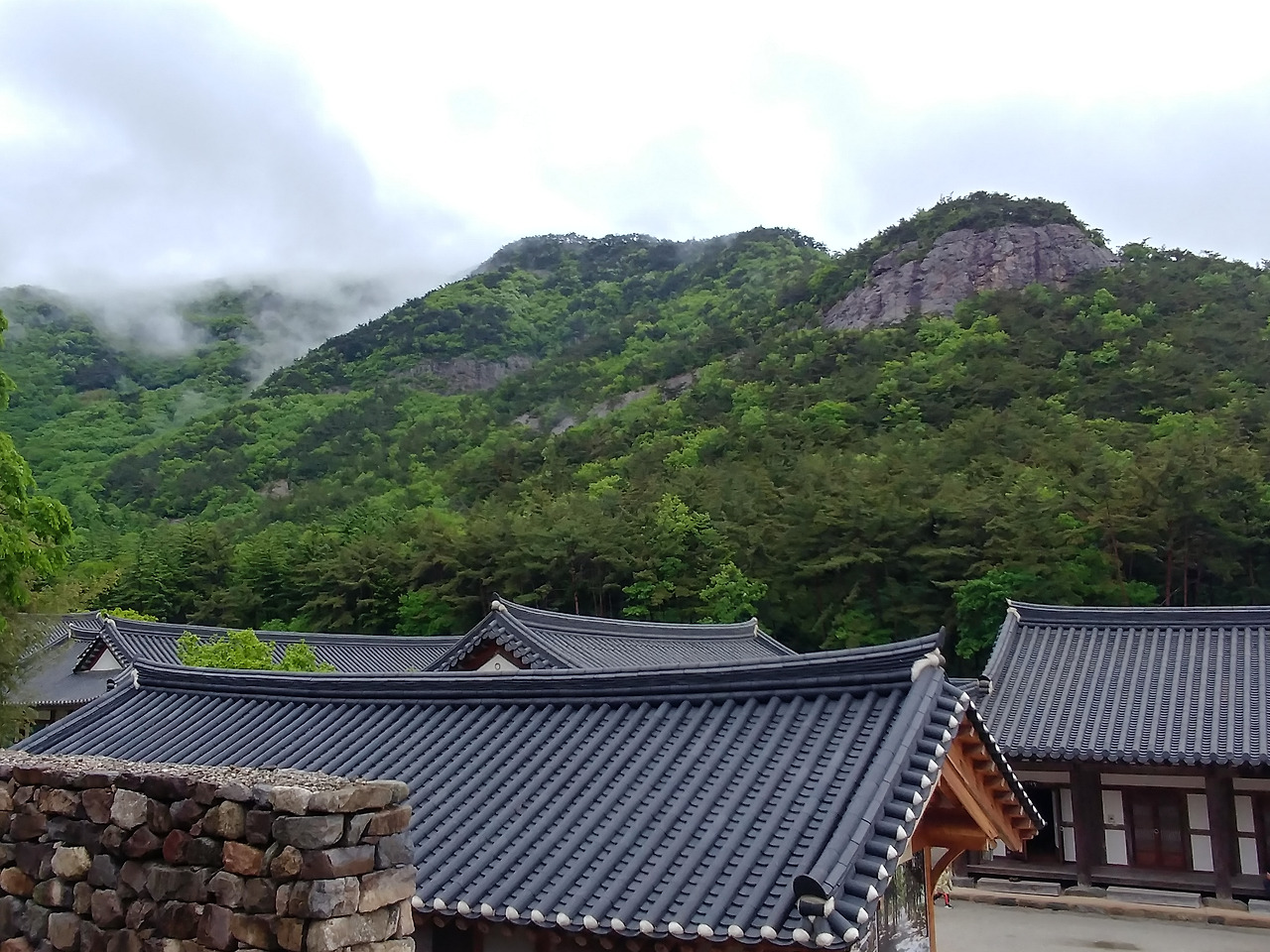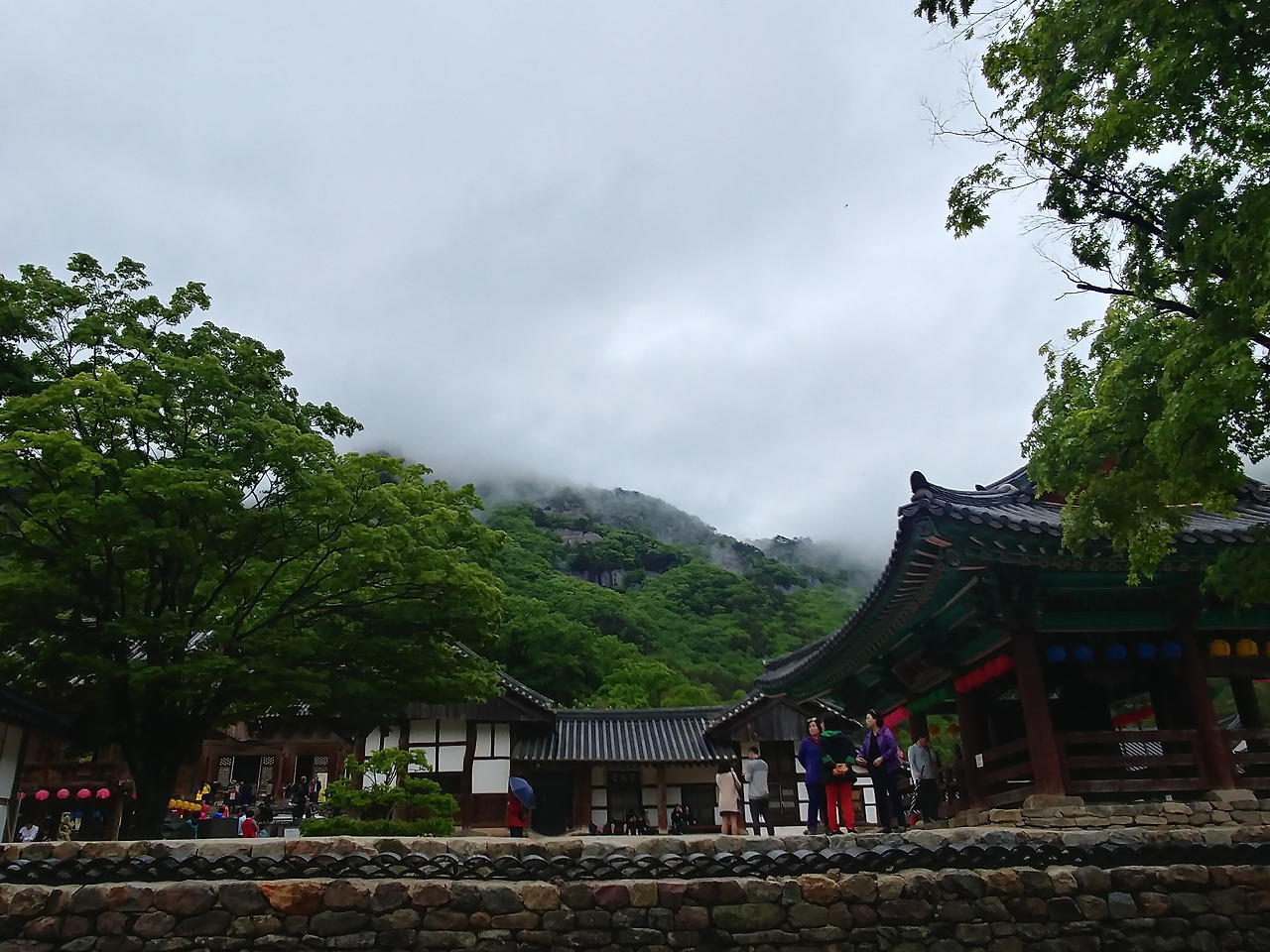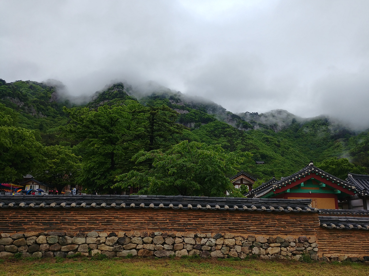 절을 두르고 있는 산봉오리들이 장엄했다. 구름들이 산봉오리들을 휘감고 있었다. 하늘에서 한두방울 비가 내렸지만 아무도 신경쓰지 않았다. 비 오는 날도 나름의 운치가 있어 좋았다.
