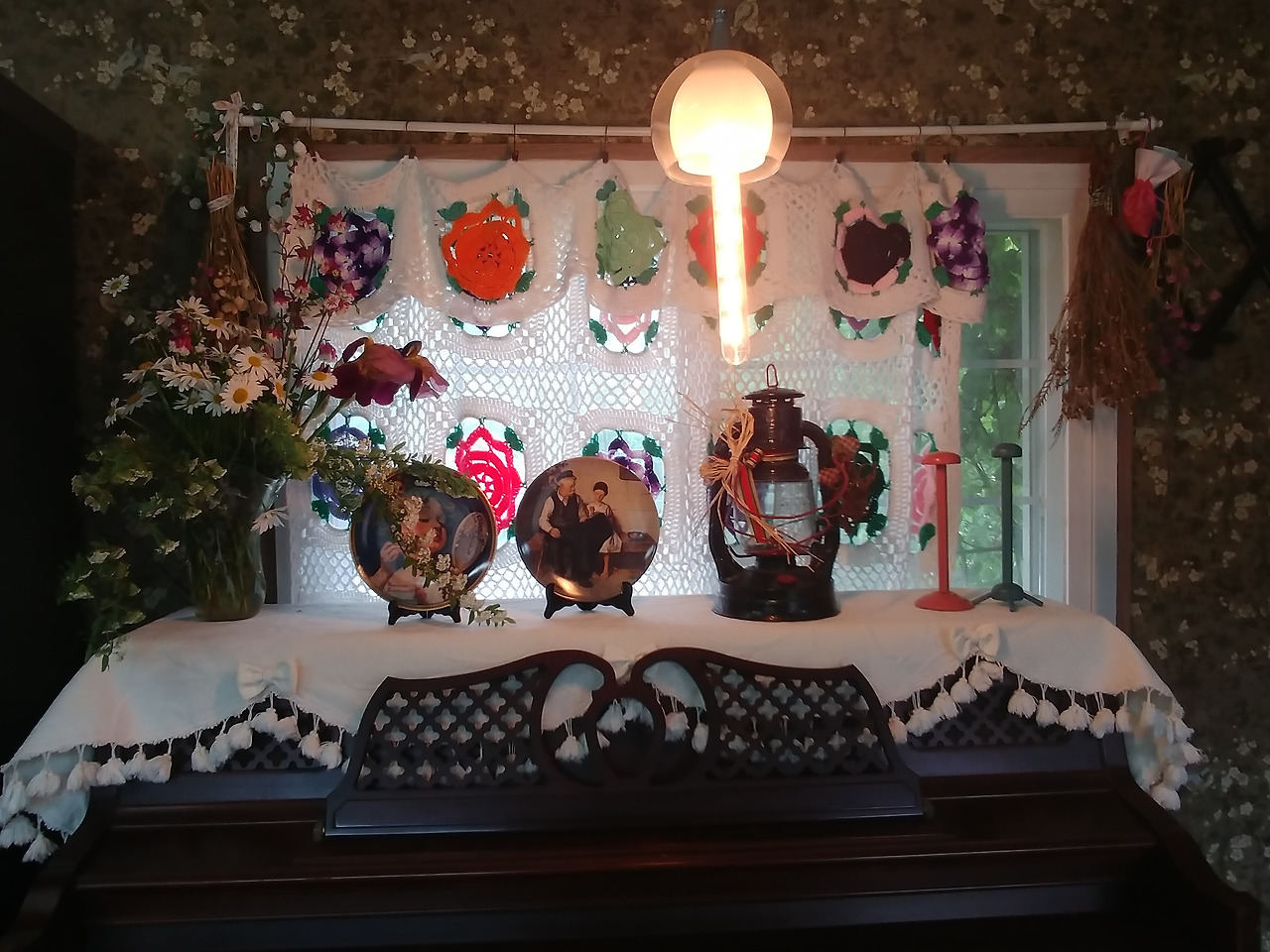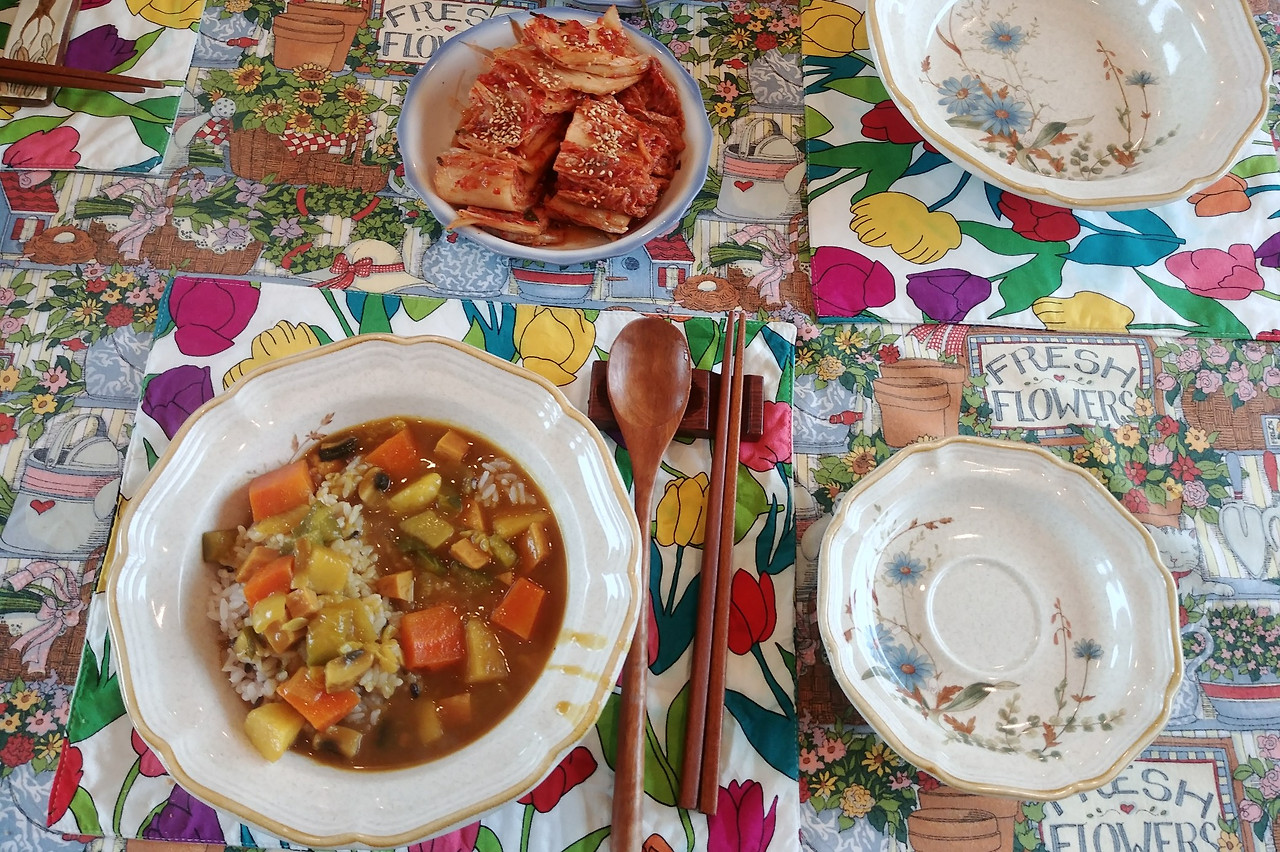 화려한 무늬의 접시들과 테이블보, 말린 꽃들과 자수 용품들...
