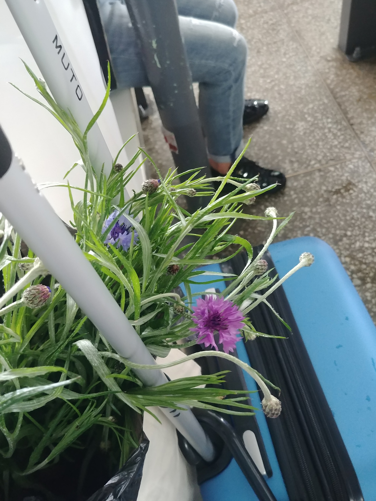 아주머니께서 주신 수레국화 화분과 다발을 들고서 말이다.