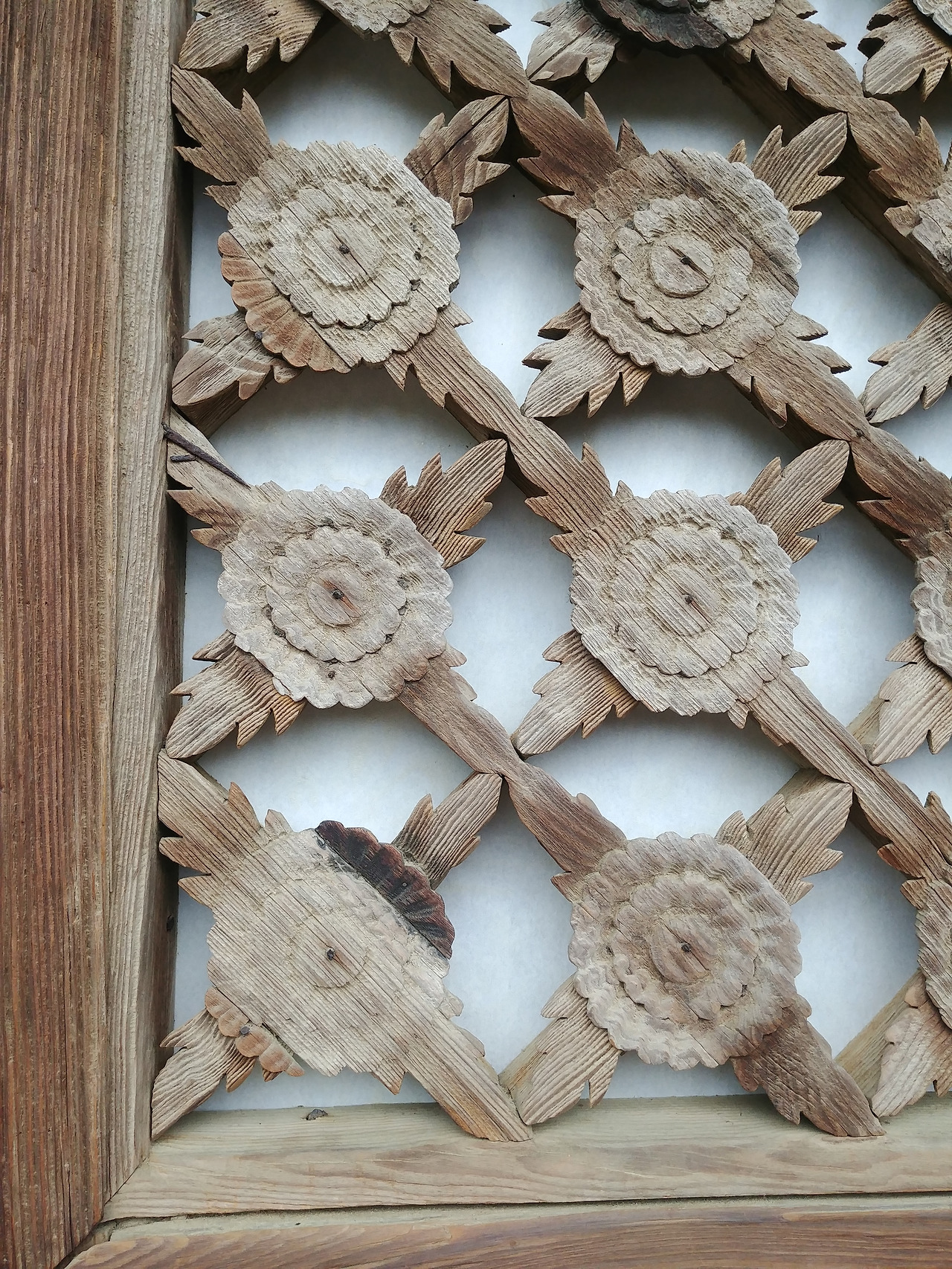 결이 아름다운 나무 문에 꽃무늬가 조각되어 있었다.