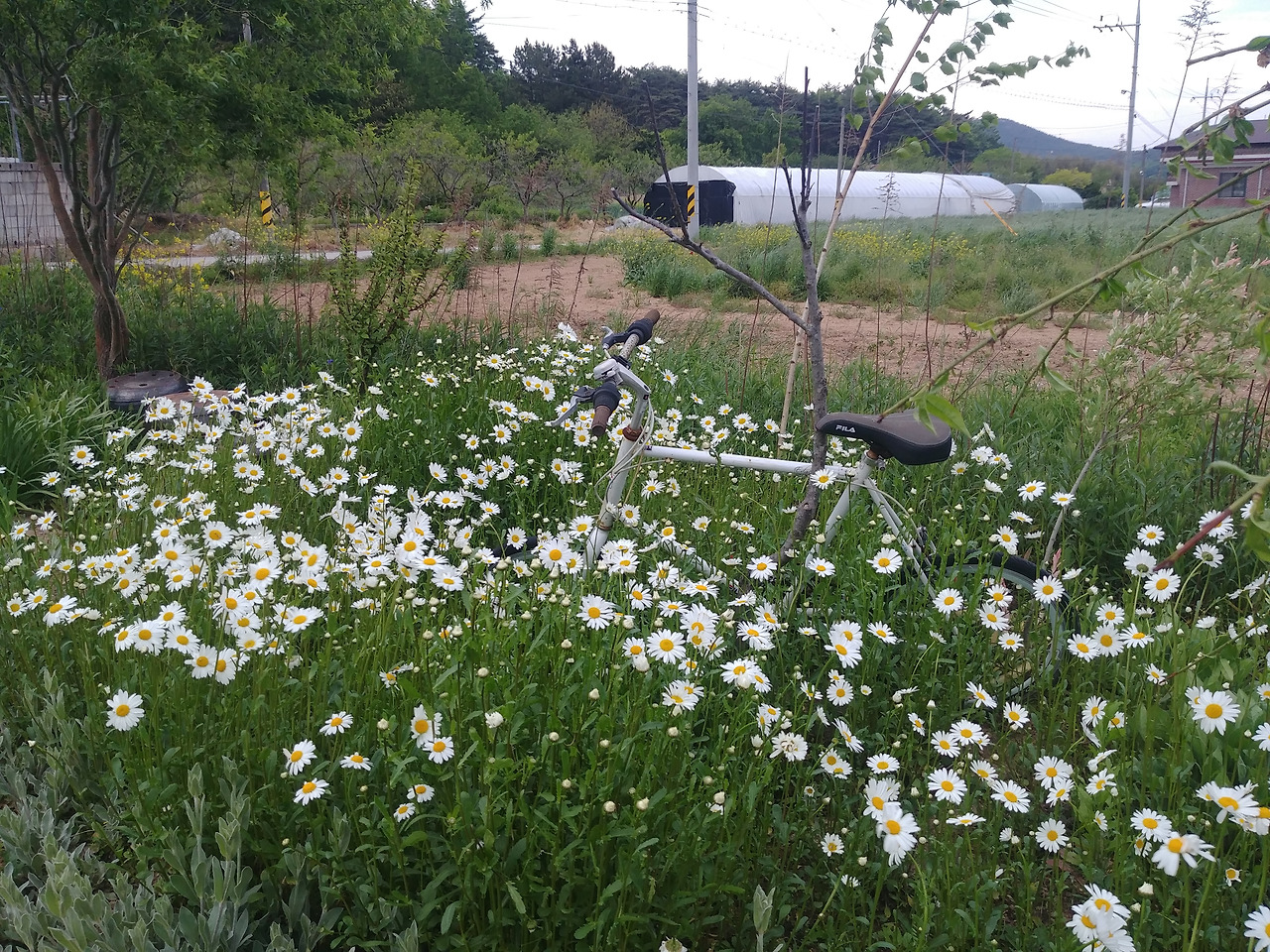아주머니께서 한아름 수레국화를 꺾어다가 집에 가서 화병에 꽂아놓으라고 주셨다.