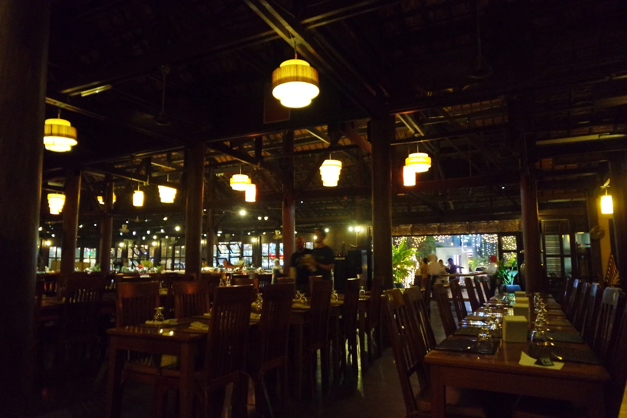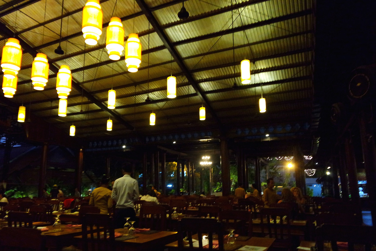 식당에 도착하고 툭툭기사와는 안녕했다. 안으로 들어오니 족히 100명은 넘게 들어갈 것만 같은 넓은 공간이 펼쳐졌다. 천장에 달린 조명과 넓은 무대, 곳곳에 세워진 나무 기둥 등 인테리어가 무척 이국적이었다. 분위기로 반은 먹고 들어가는 식당이다.