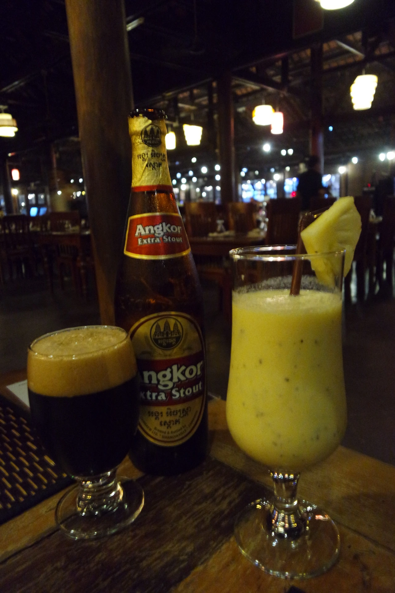 우리가 시킨 음료는 앙코르 비어와 파인애플 쥬스이다. 앙코르 비어는 씨엠립에 왔으니 먹어봐야할 것 같아서 시켰다. 뚜껑에는 앙코르와트가 그려져 있었다. 그리고 파인애플 쥬스! 원래 망고를 더 좋아하는데 캄보디아의 1월이 파인애플 제철이라는 소리를 들었기에 일부러 파인애플 쥬스를 시켰다.