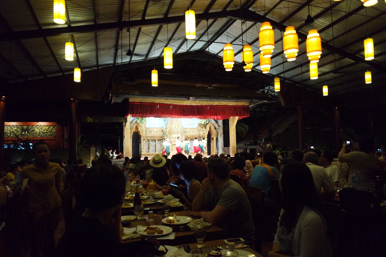 압사라 쇼를 보면서 흥겨운 저녁식사를 계속했다. 갑자기 외국으로 여행 온 느낌이 확 들었다. 무대에서 이국적인 복장을 입은 사람들이 춤을 추고 있었다. 여럿이 추기도 하고 혼자 추기도 했다. 특히 혼자 추던 압사라 댄스가 최고였다.