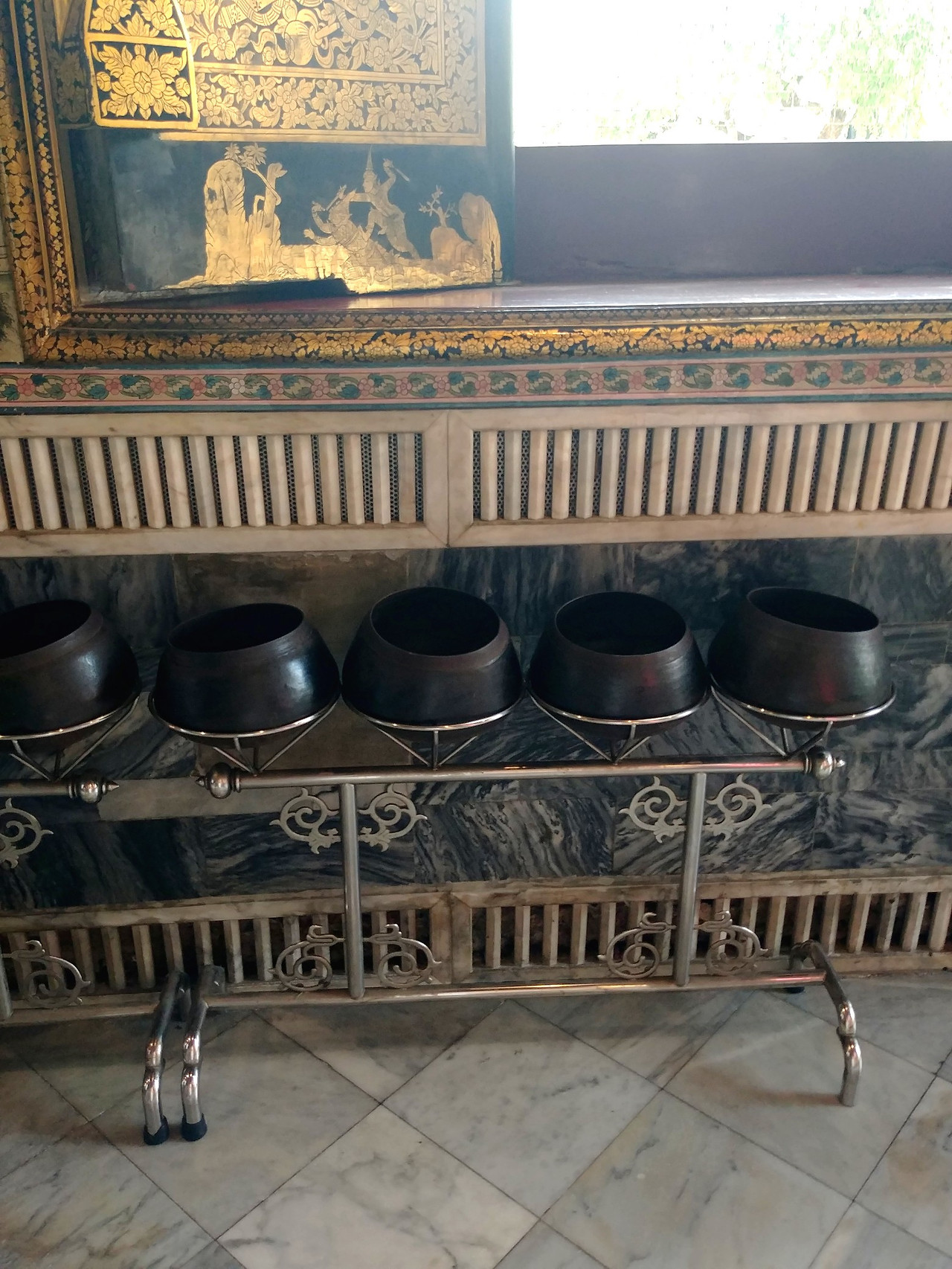 와불상 뒤로는 조그맣고 동그란 놋쇠 항아리들이 줄지어 놓여있다.