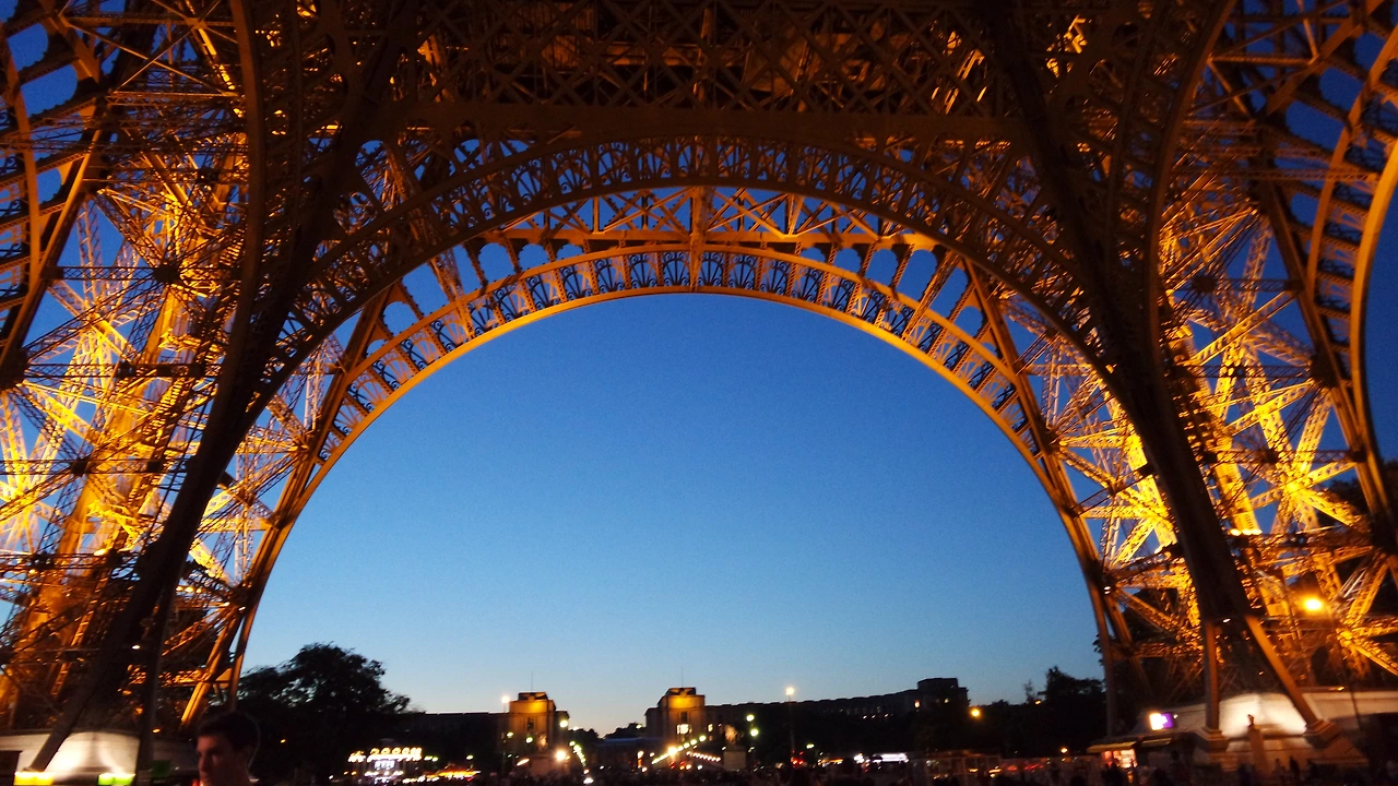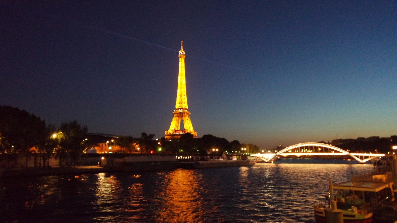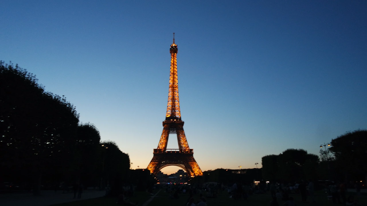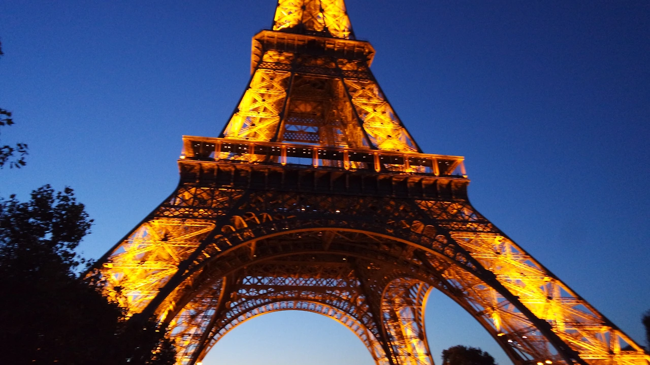 진한 금빛으로 검푸른 하늘을 물들이는 에펠탑.