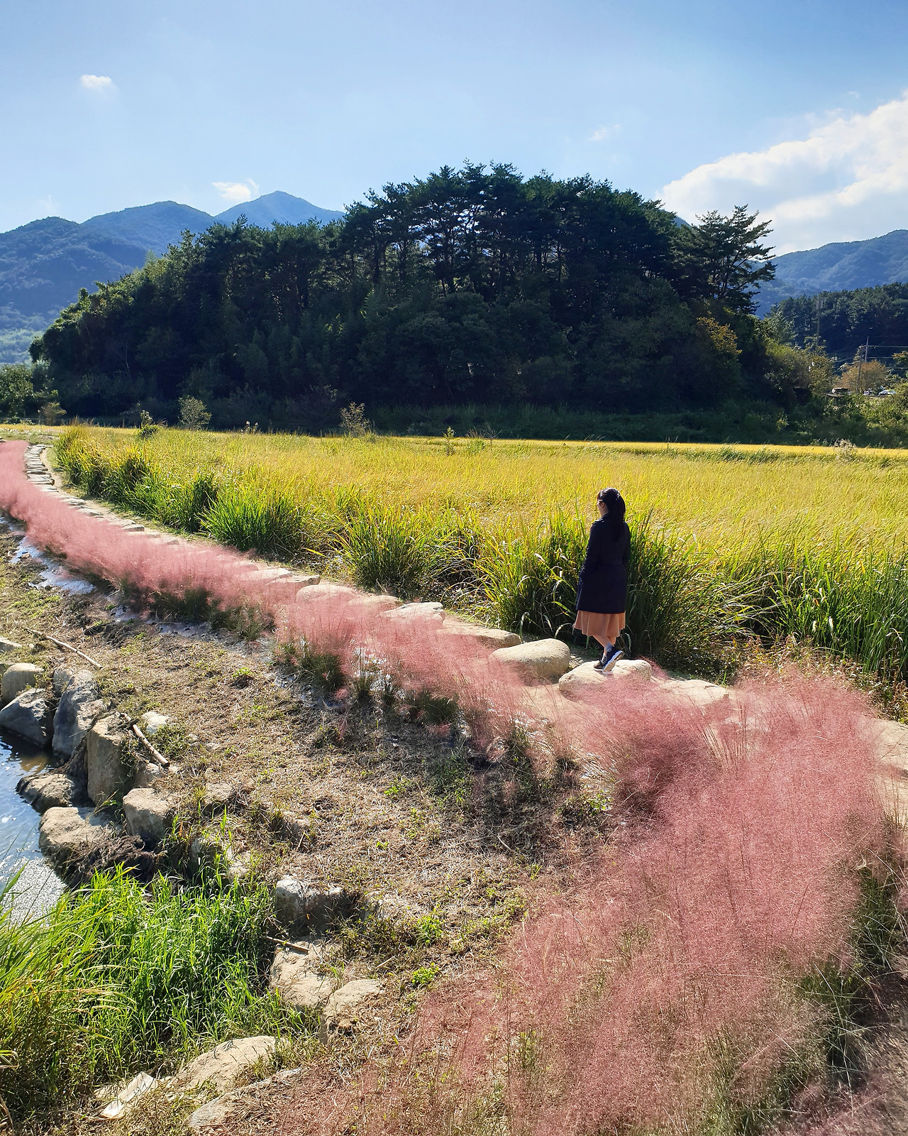 돌 길 좌편으로 핑크빛으로 하늘거리는 억새들이 만발했다.
