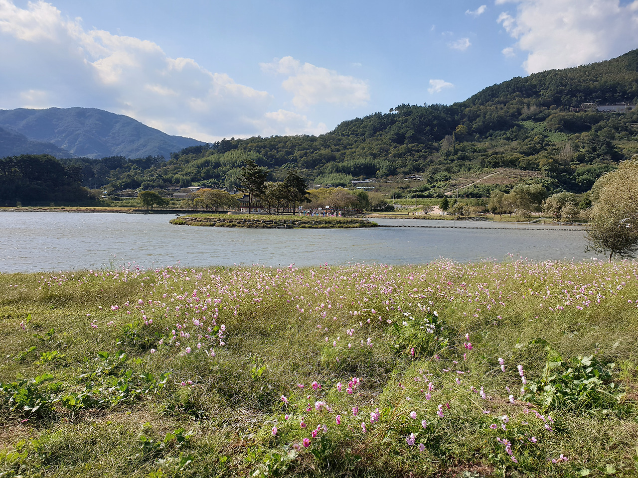 호수 옆 코스모스 밭을 뒤로하고
