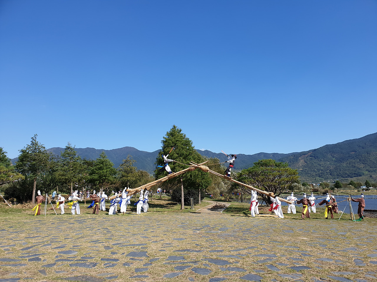 호수 옆에 차전놀이하는 허수아비들이 있었다.
