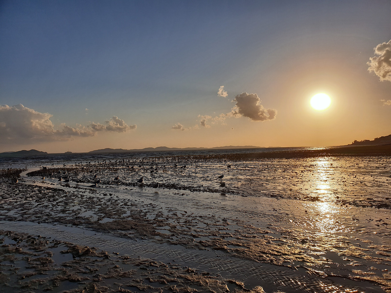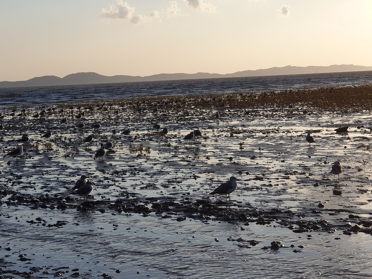 갯벌 위에서 갈매기들이 휴식을 취하고 있었다.