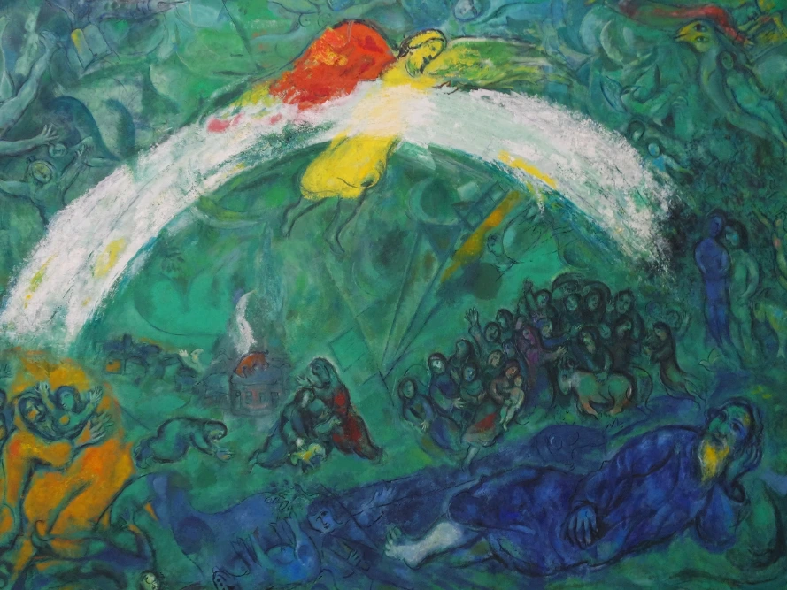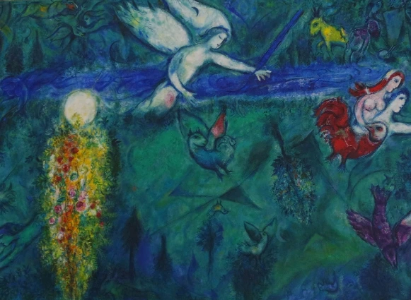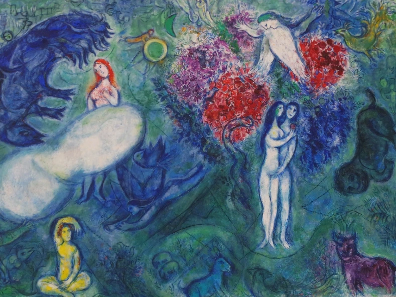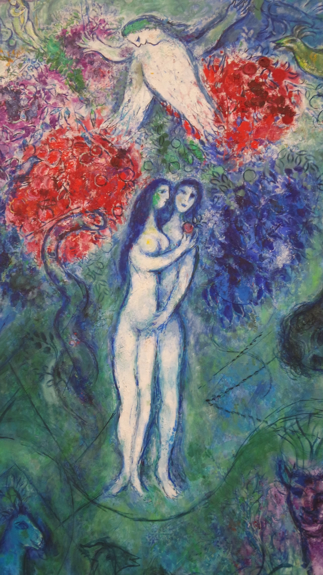 아담과 이브 이야기를 모르더라도 이 그림은 사람을 잡아끄는 힘이 있었다. 사랑스러운 두 연인, 붉은 꽃다발과 열매. 나는 샤갈의 푸릇한 색채와 부드러움이 좋았다. 그의 그림에는 날카로움이 없었다. 사랑과 행복이 담겨있고 몽환적이며 따뜻했다.