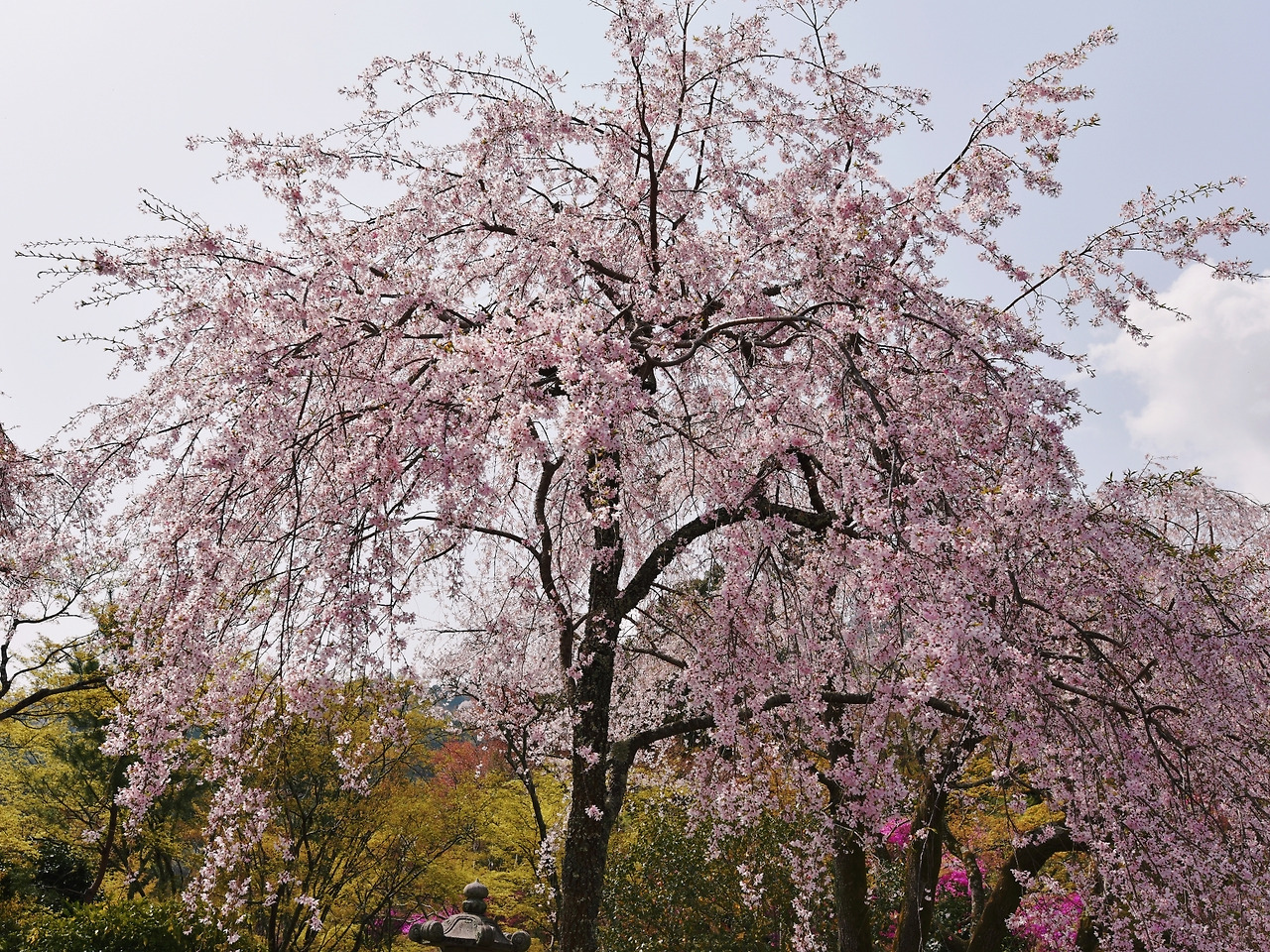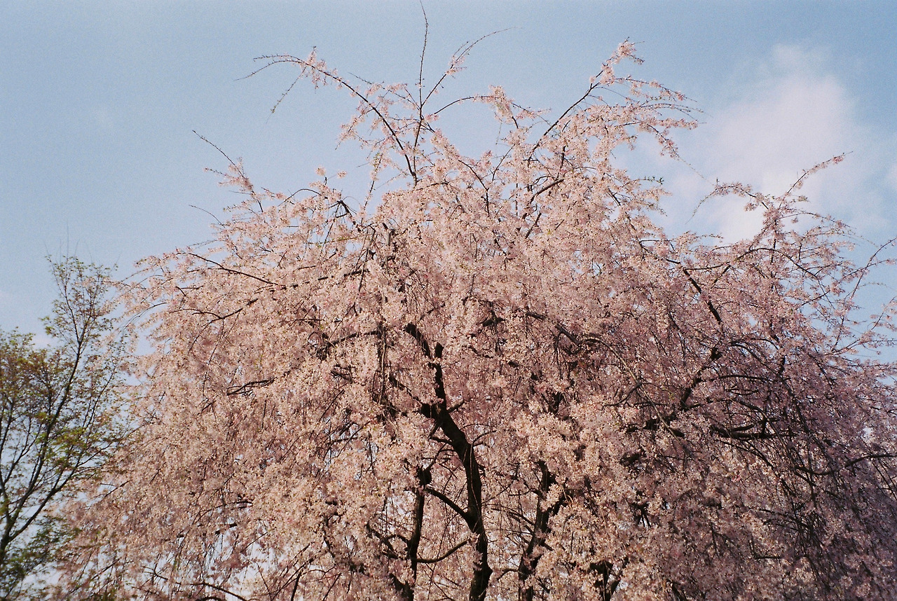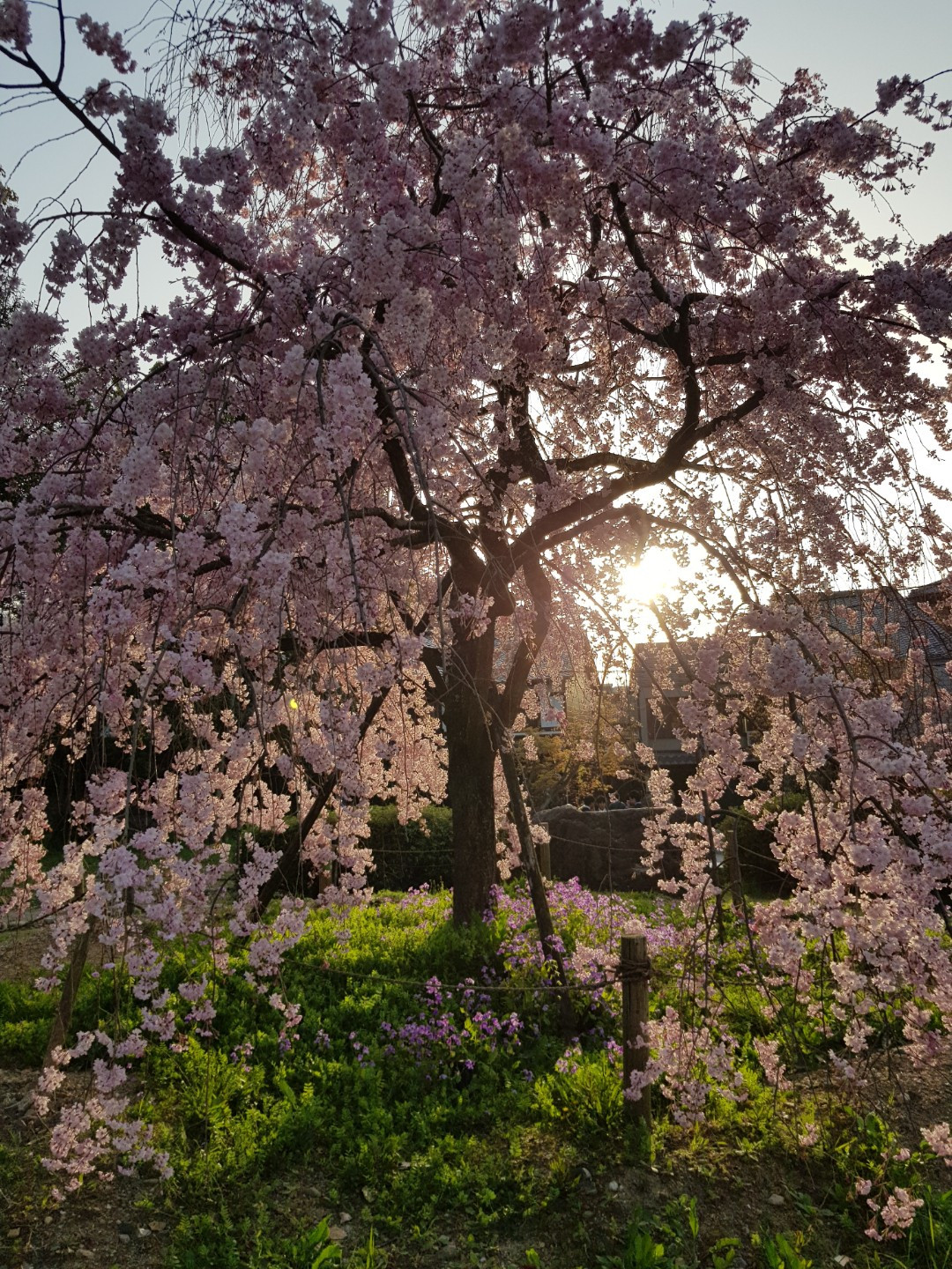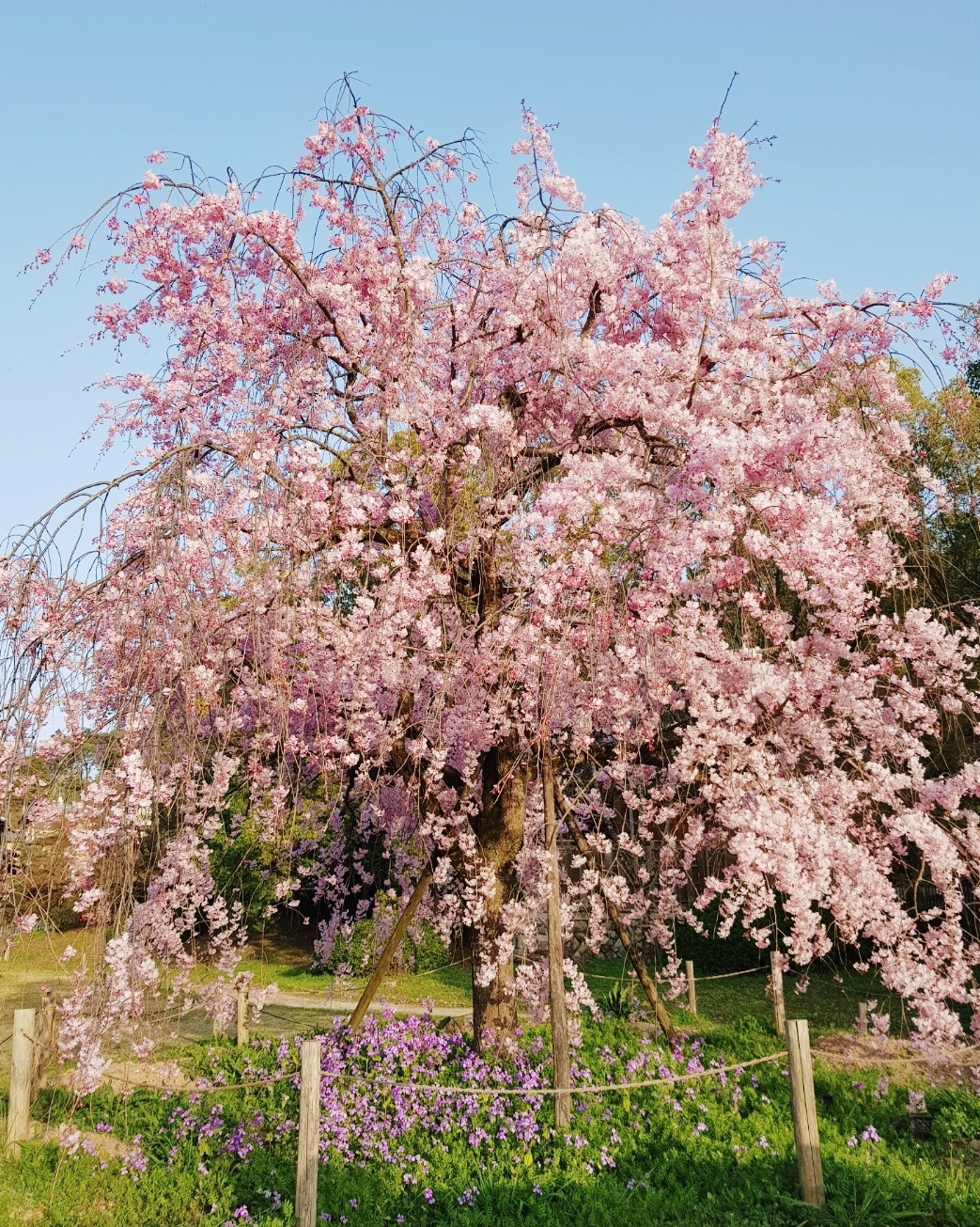 목적지를 정해두고 걷다가 보면 갑작스레 벚꽃 만발한 풍경이 펼쳐지기도 했다. 그런 경우 우리는 한참 동안 그 주위를 맴돌다가 다시 목적지로 향했다. 헤이안 신궁 쪽으로 걷다 만난 어느 이름 모를 공원이 떠오른다. 그곳에서 아름다운 수형의 거대한 벚꽃을 만났다. 벚꽃 아래에는 푸릇한 잡초들과 보랏빛 꽃들이 피어나있었다.