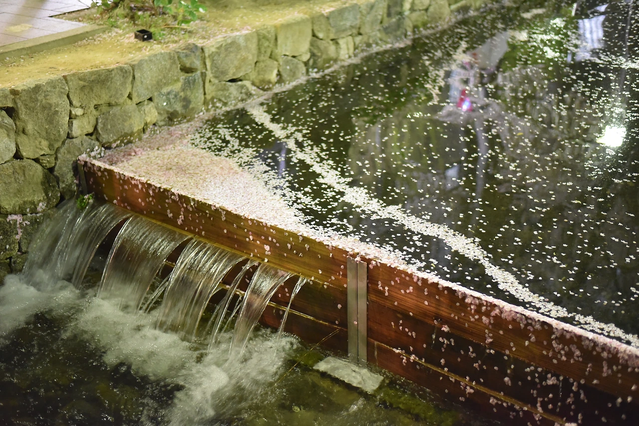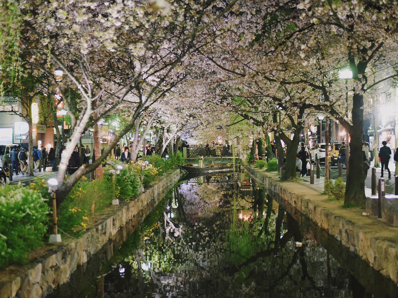 가와라마치 역 근처를 서성이다 보면 카모가와에서 뻗어 나온 실개천이 보인다. 이 실개천을 따라 정처 없이 걷다 보면 황홀한 풍경들이 펼쳐진다. 벚꽃잎들이 밤하늘과 실개천을 가득 채운다. 그리고 잔잔히 흐르는 물결 위로는 선명한 반영이 일렁인다.
