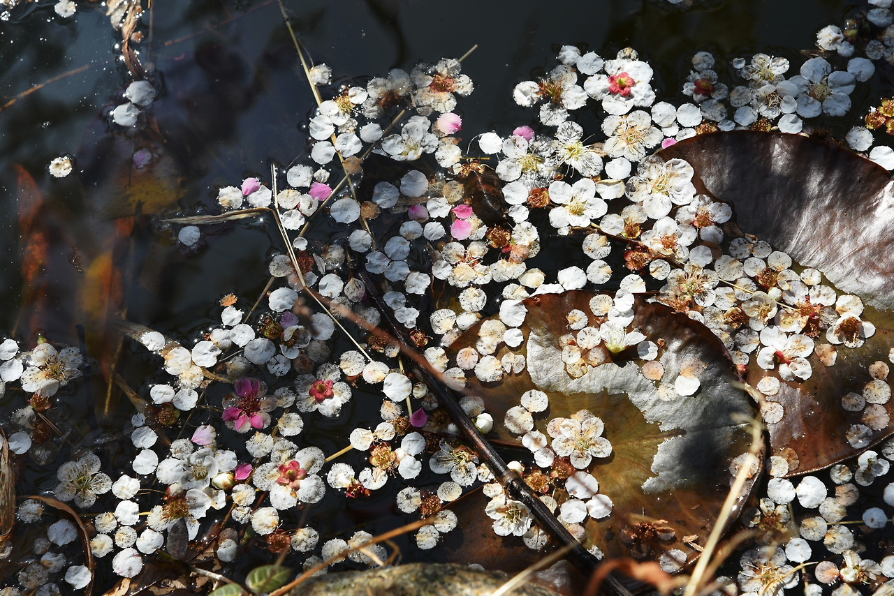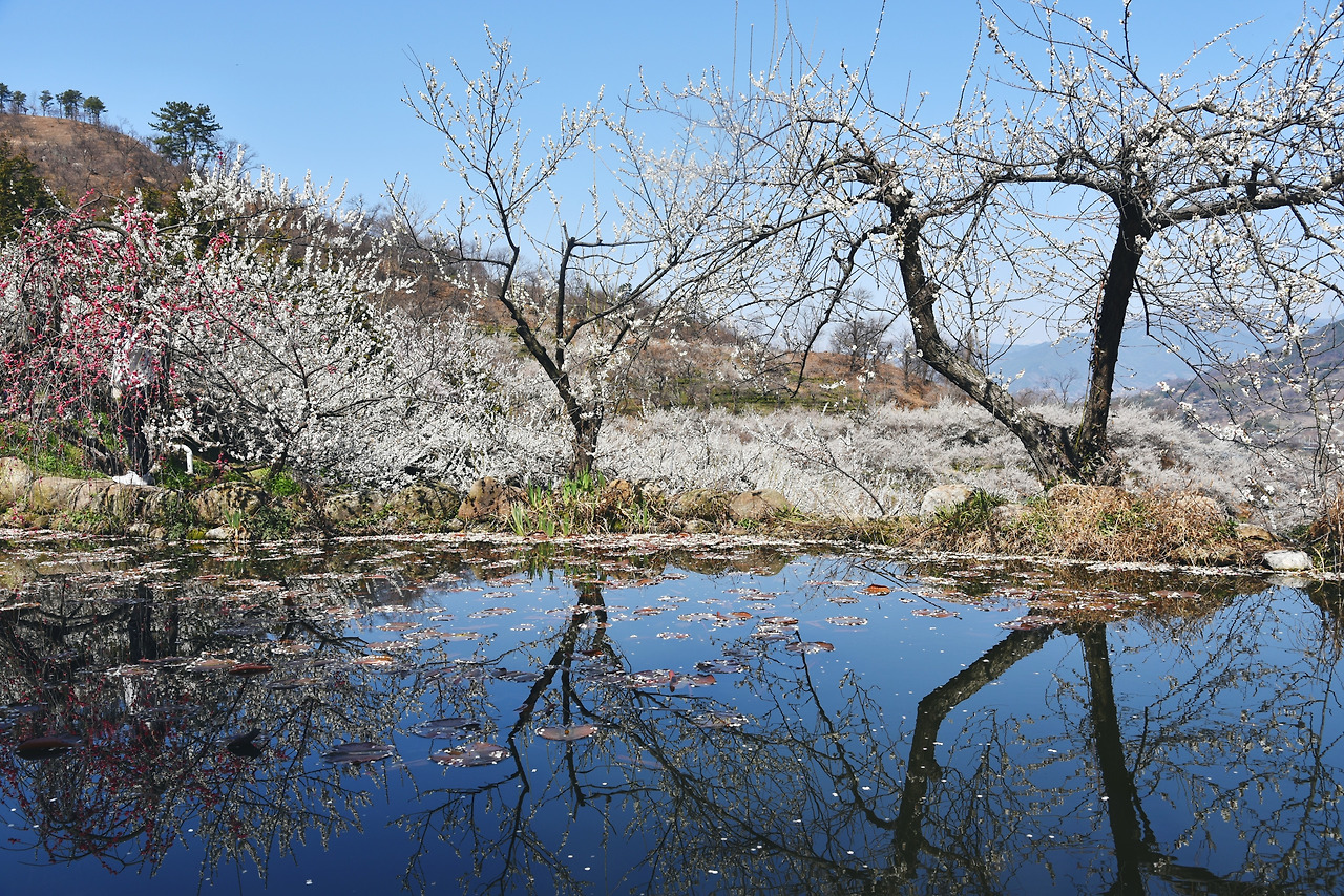 못 뒤로 끝없는 매화밭이 보였다. 고요한 못 위로는 하늘도 담겨있고 매화 나무도 담겨있다.