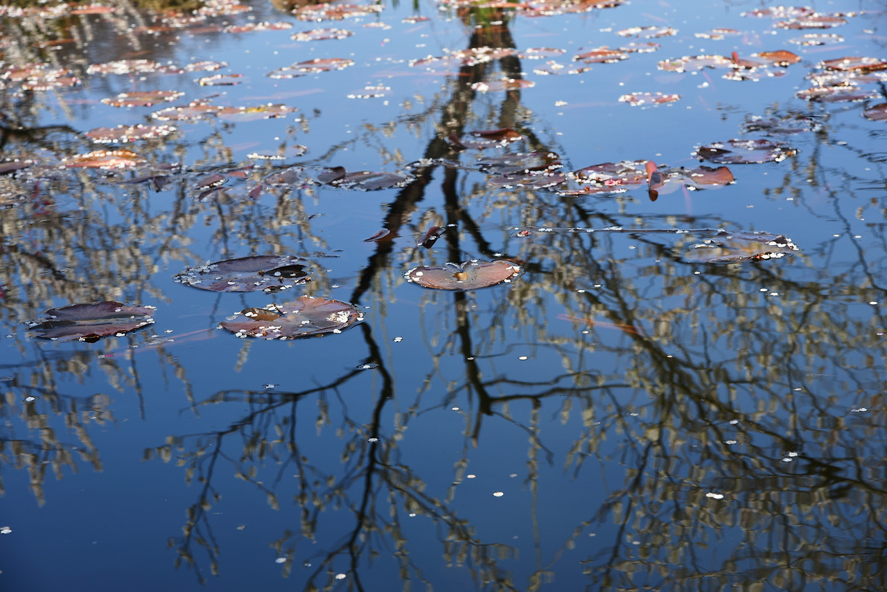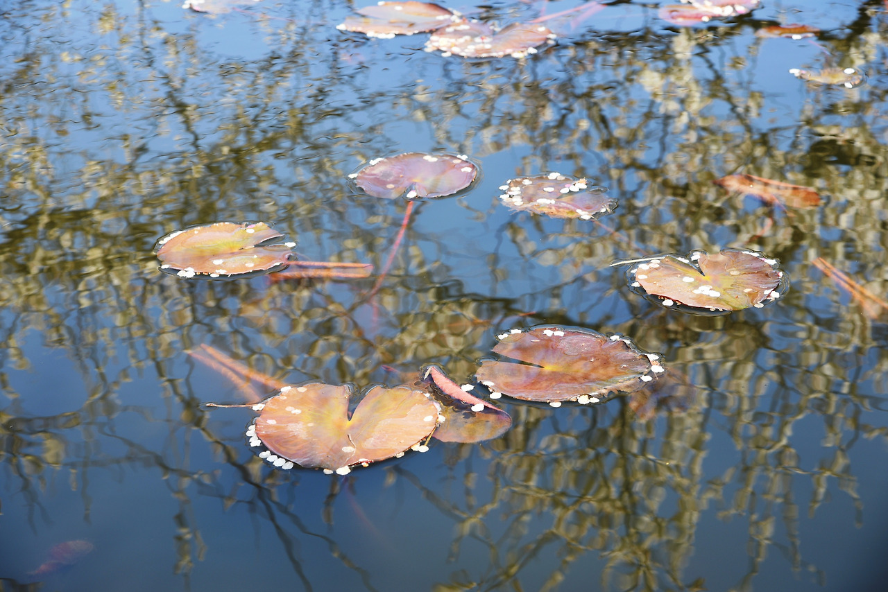 물 위에 잔잔히 떠있는 연잎들 동글동글한 모양이 귀엽다. 꽃잎이 떨어져 못 위를 하얗게 수놓고 있었다.