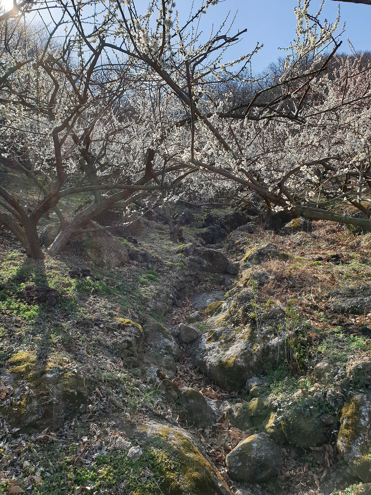 물 마른 작은 골짜기 그 위로도 매화가 가득이다.