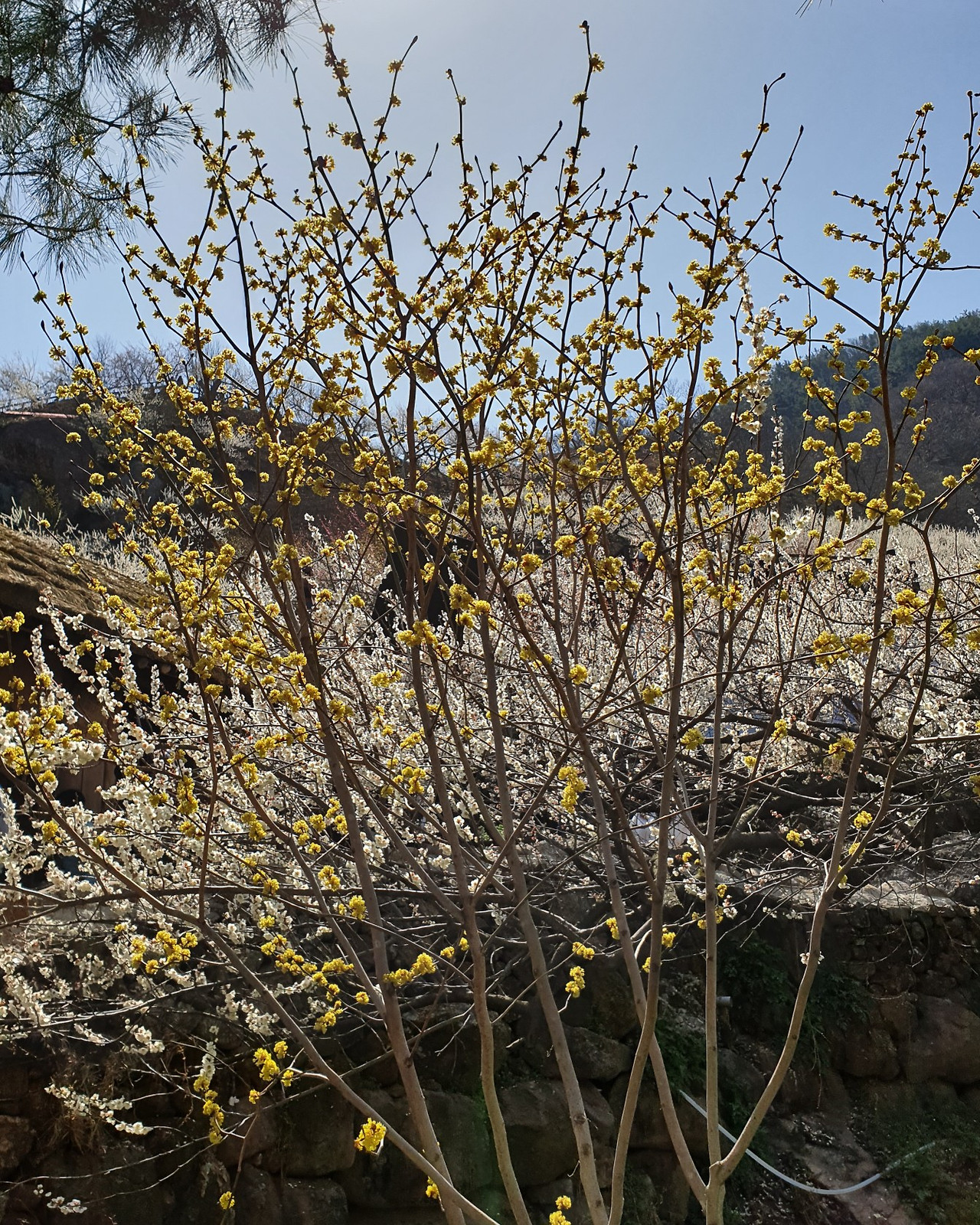 봄을 알리는 노오란 산수유 꽃은 하얀 매화를 벗삼아 돌담 옆에 피어있었다.