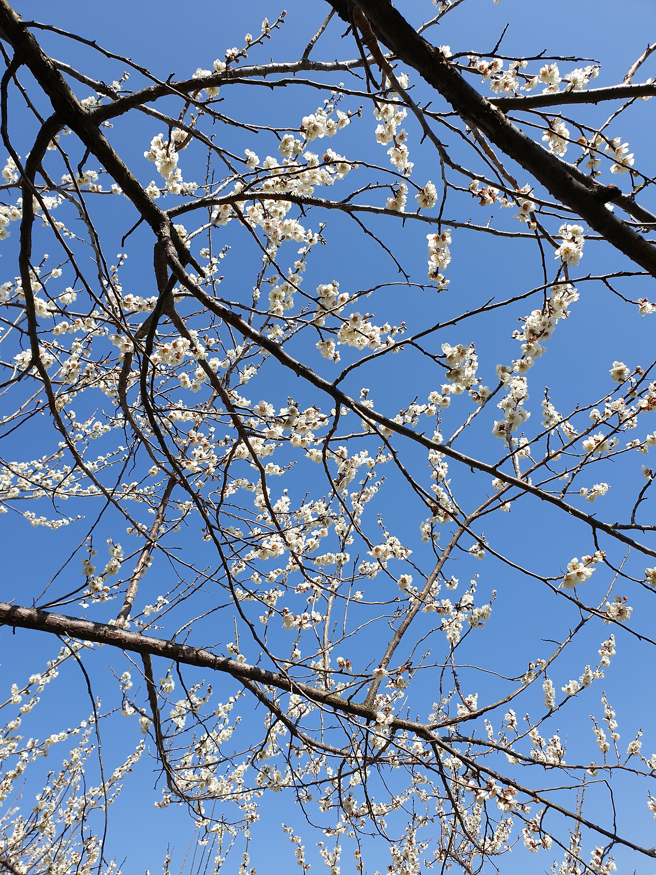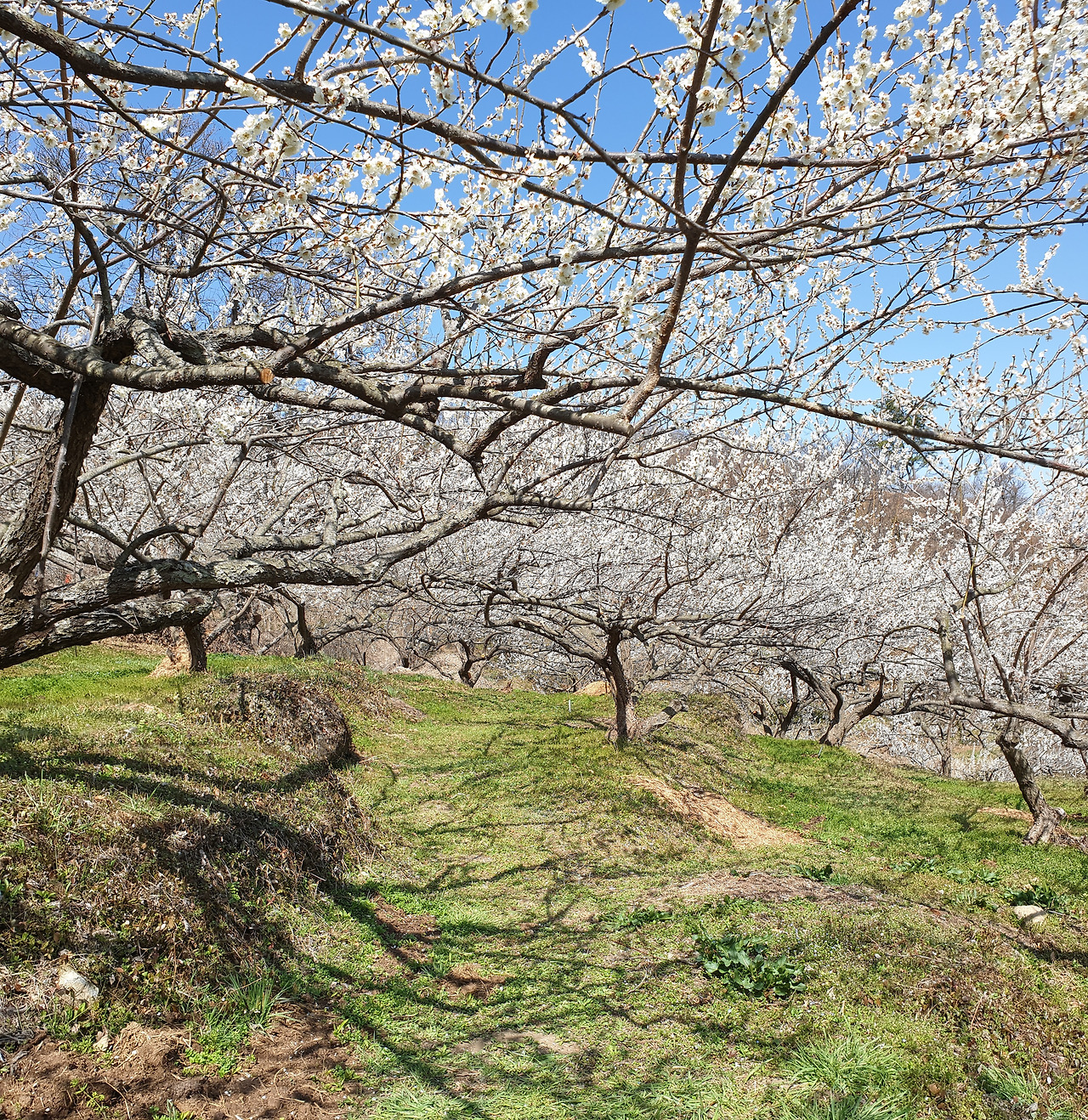 농원 깊숙히 들어가본다. 하늘은 구름 한 점 없이 푸르다. 그 아래 하얀 매화가 구름같이 떠있다.