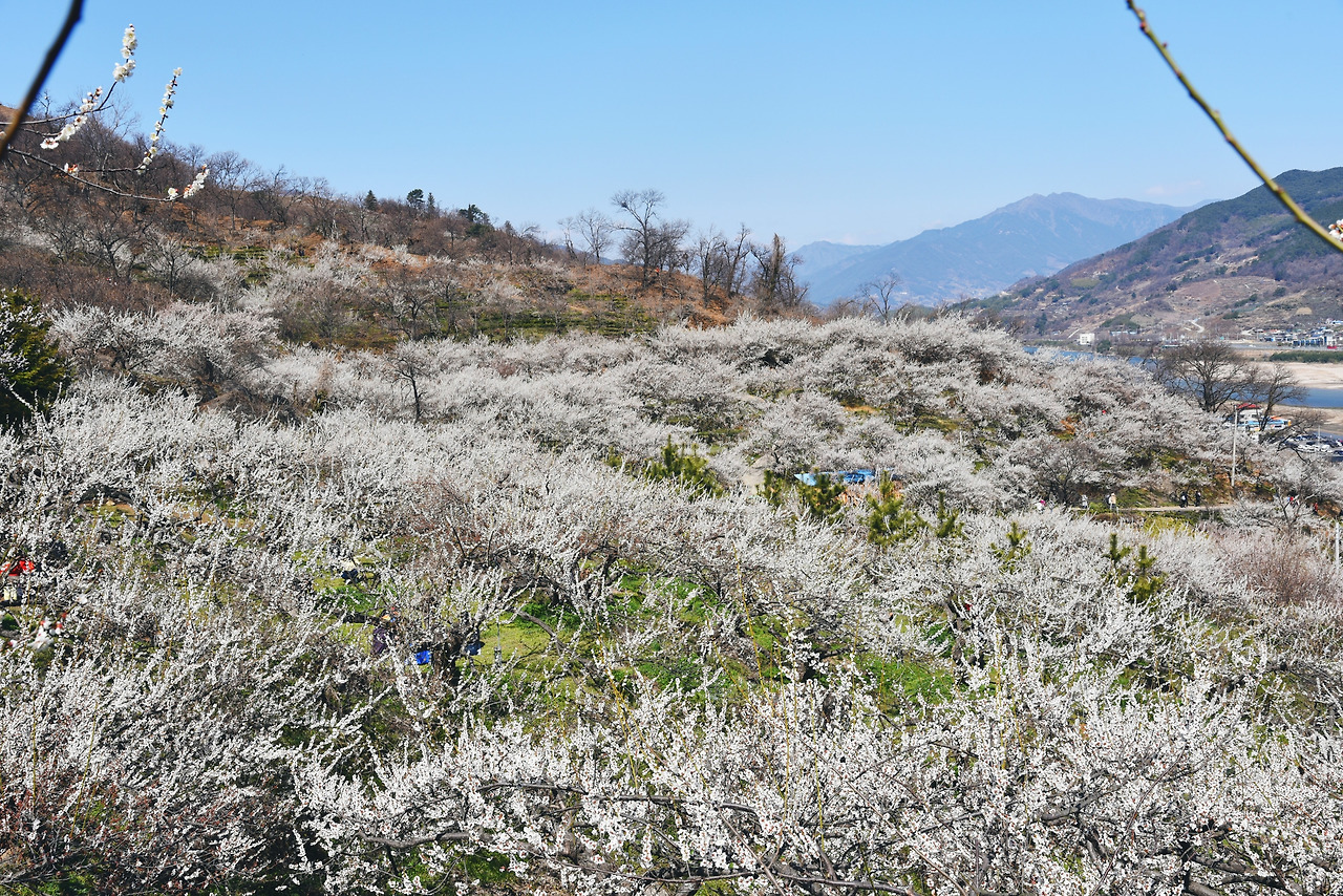 멀리 지리산 자락과 섬진강, 그리고 하얀 매화 군락