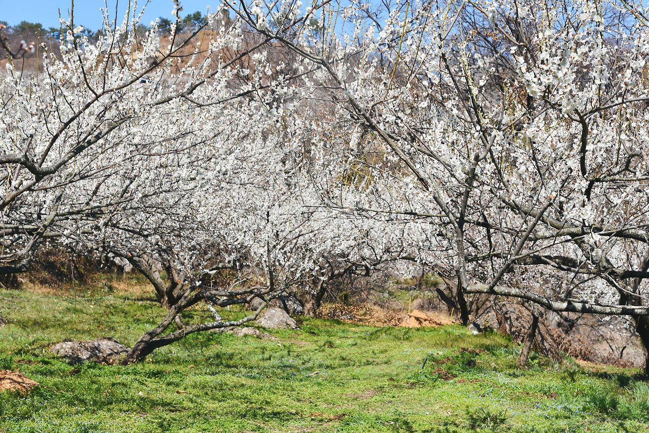 봄이 되어 땅을 비집고 나온 연두빛 잎파리들과 나무 위로 복스럽게 피어난 하얀 매화들 그리고 티없이 맑은 파아란 하늘 이 선명한 세가지 색이 눈을 즐겁게 만들어 주었다.