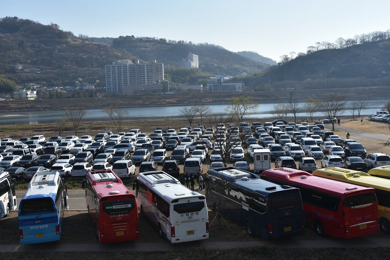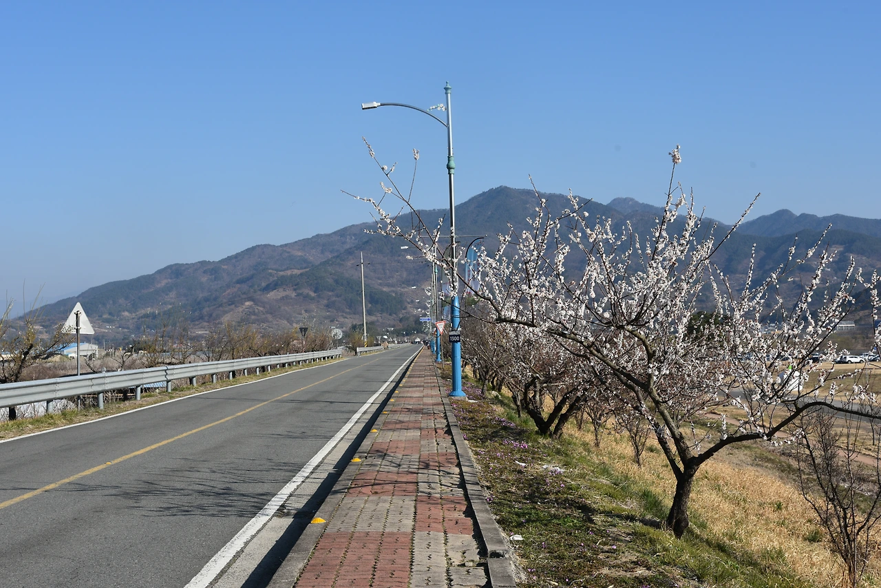 우리는 신원둔치 주차장에 차를 세워놓고 매화 축제장까지 걸어갔다. 대략 20분 정도 걸었던 것 같다. 축제장 근처에도 주차장이 있지만 그냥 세우고 걸어들어가는 것이 정신건강에 좋다. 매화 주차장 근처에 이르니 이른 아침인데도 차가 도로 위에 멈춰 서 있어 몇시간 뒤에나 주차가 가능할 듯 싶었다.