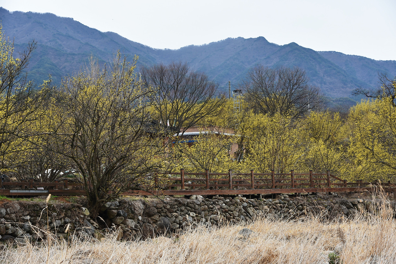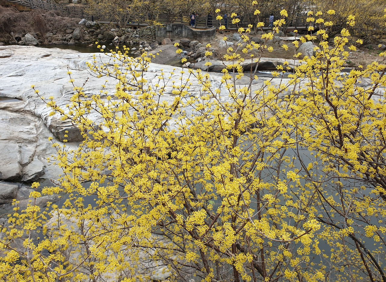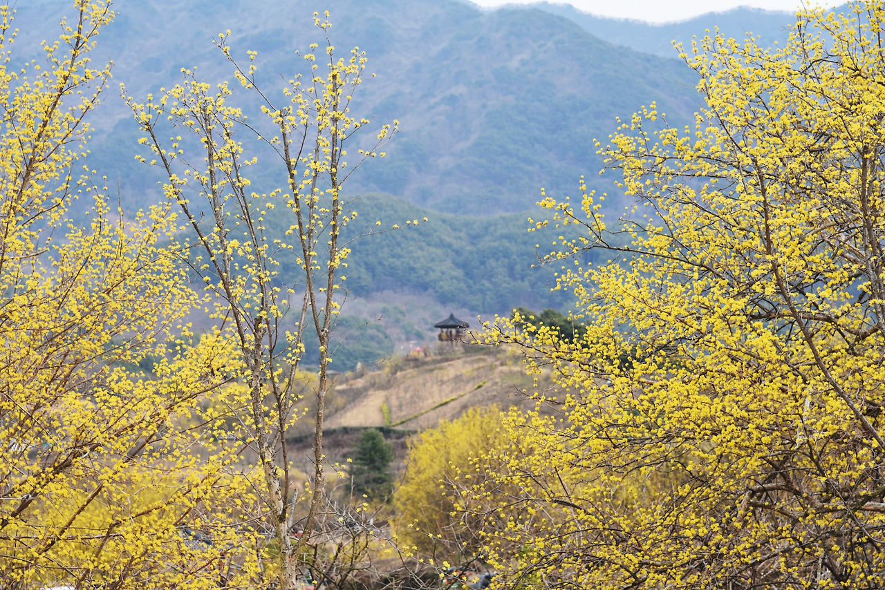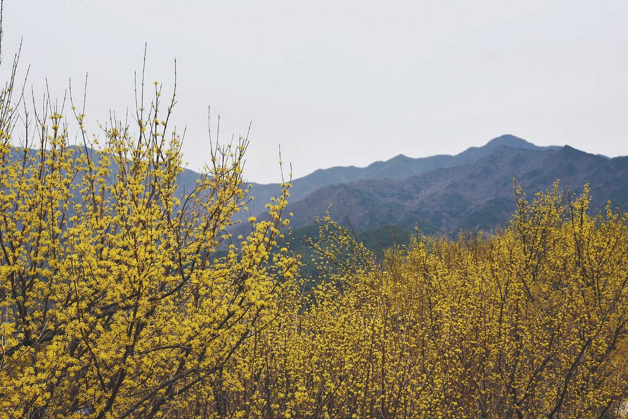 그 주위로 노란 산수유 꽃