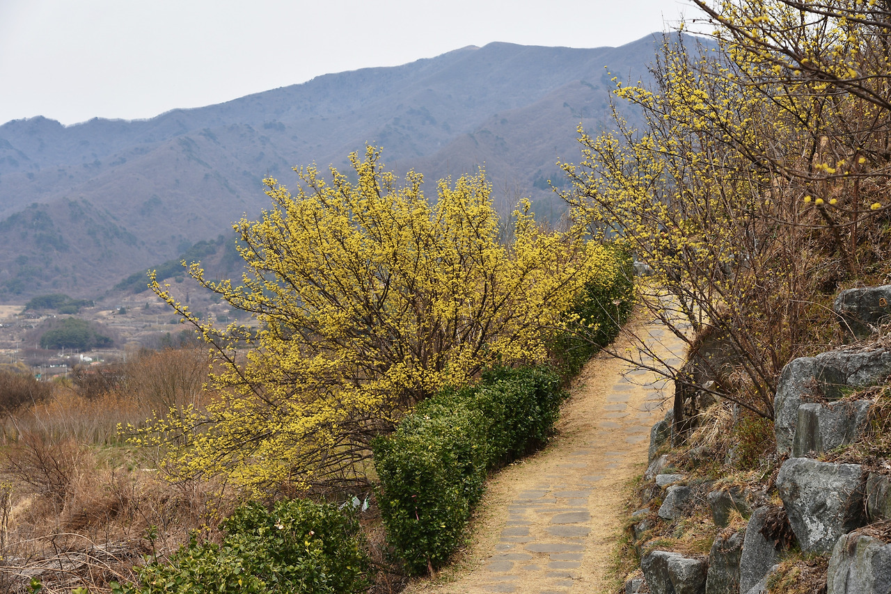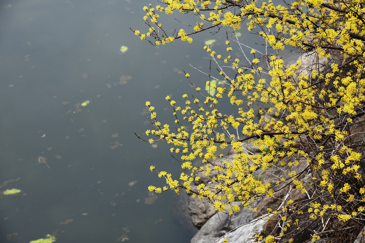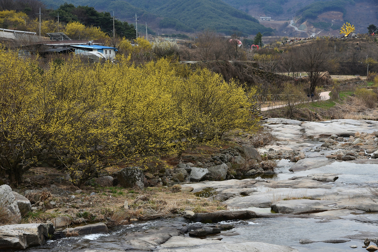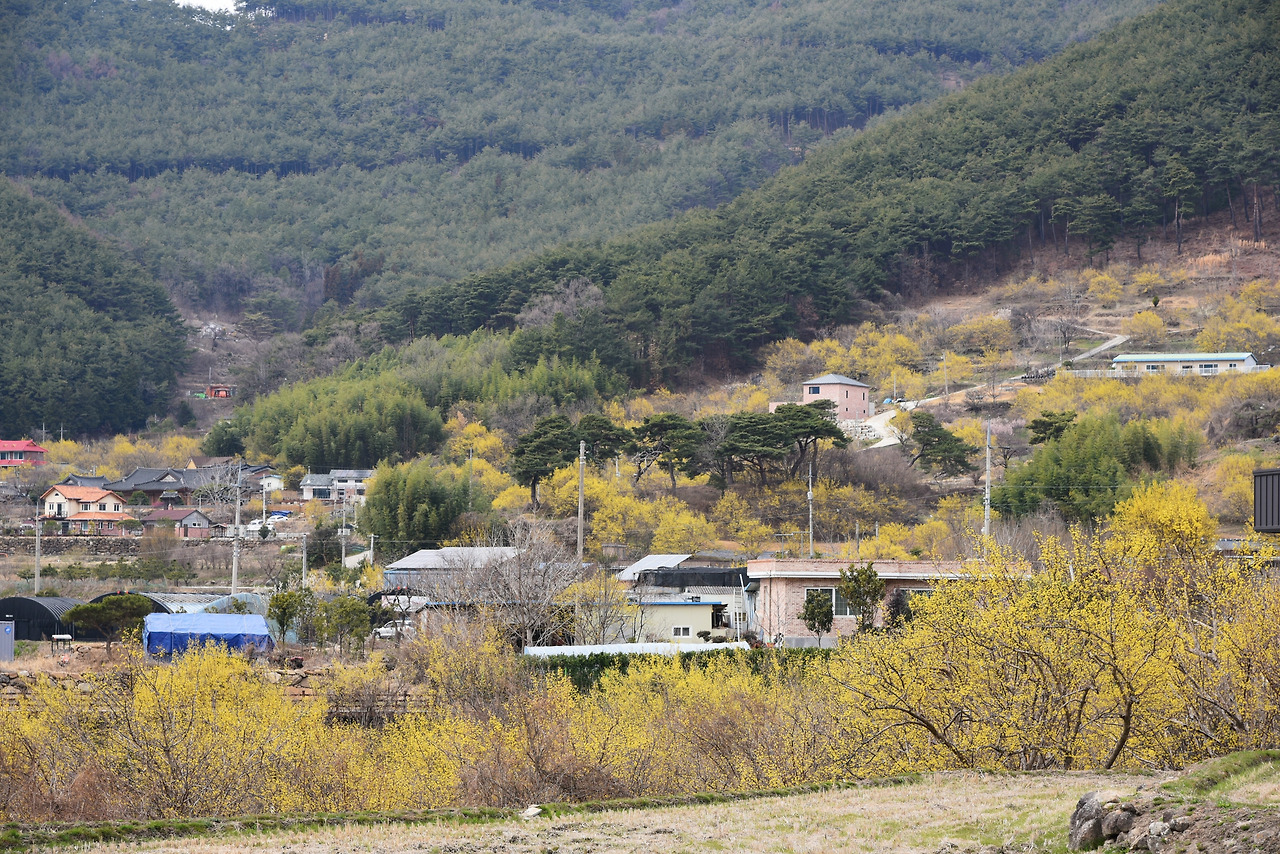 그 주위로 노란 산수유 꽃