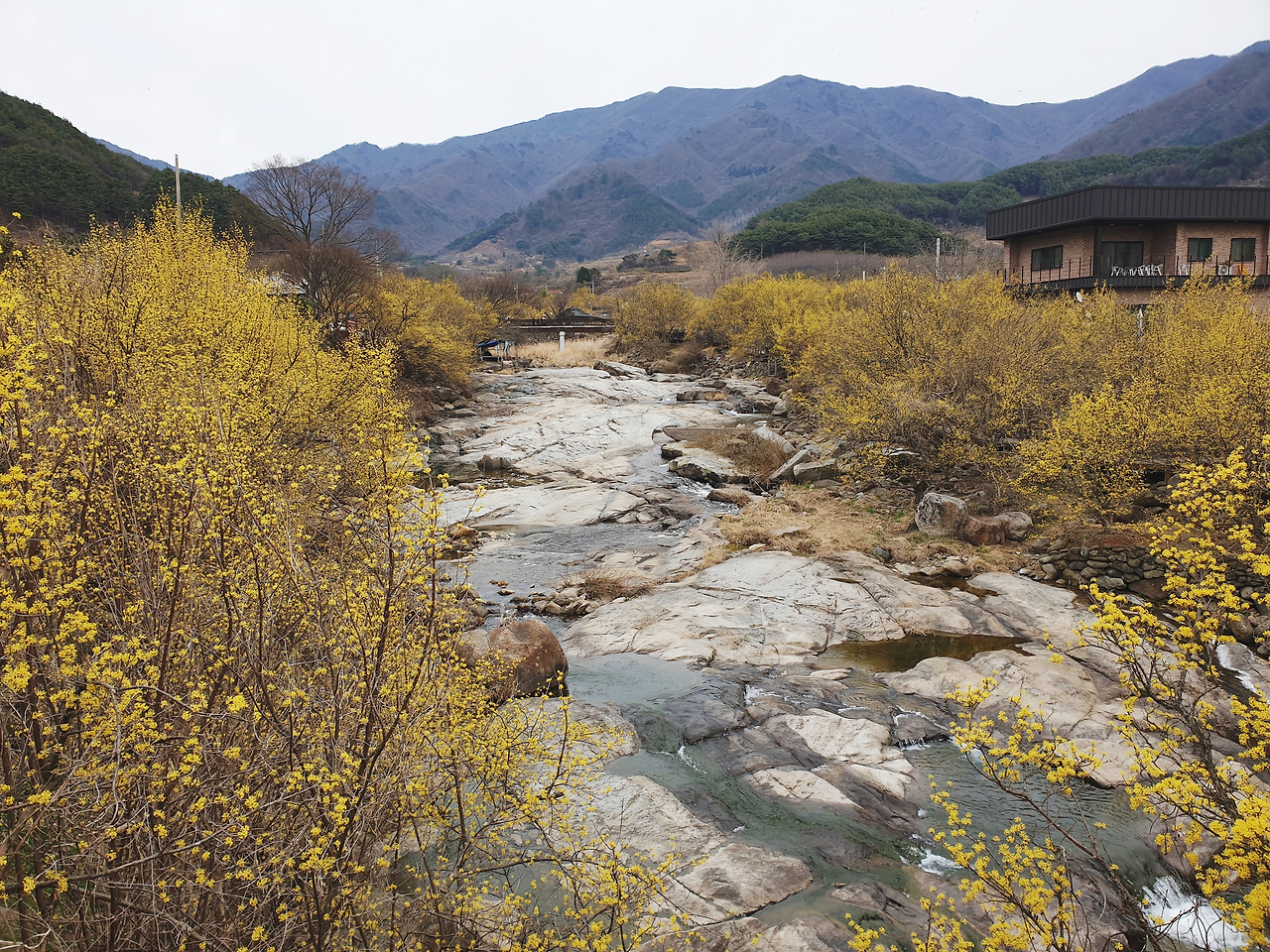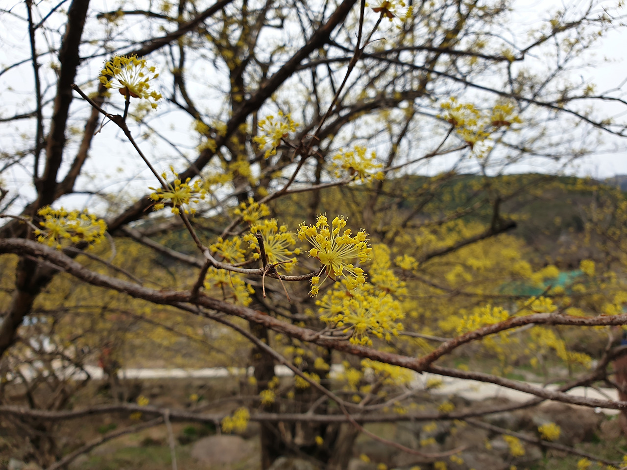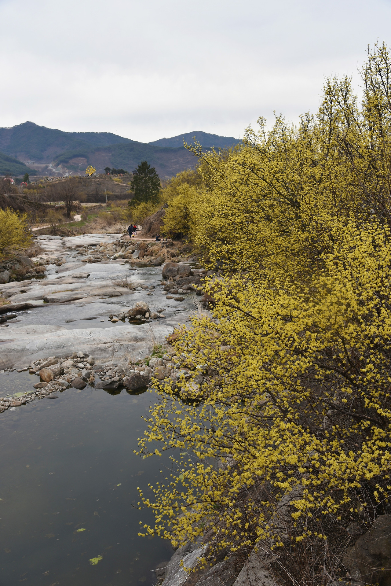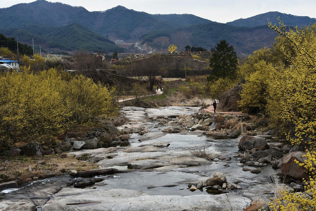 그 주위로 노란 산수유 꽃
